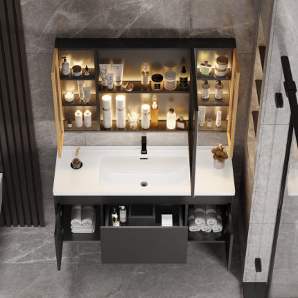 热销洗手卫生间一体陶瓷盆浴室柜组合套装智能镜柜实木深灰脸盆漱