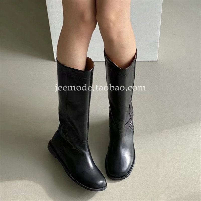 小池在首尔靴子女2024新款秋季圆头低跟套筒ins风酷帅高筒骑士靴