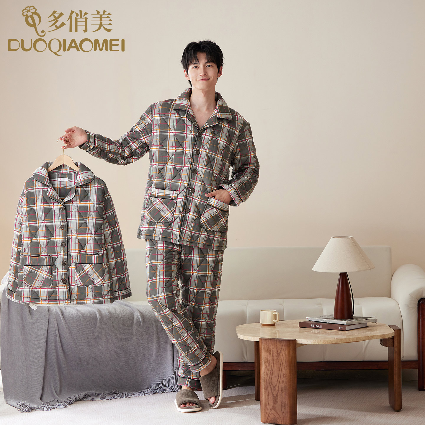 冬季纯棉夹棉睡衣男装三层加厚