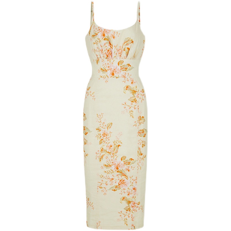 【断码清仓】Ching's 订染印花吊带裙 棉麻复古包臀裙开衩连衣裙