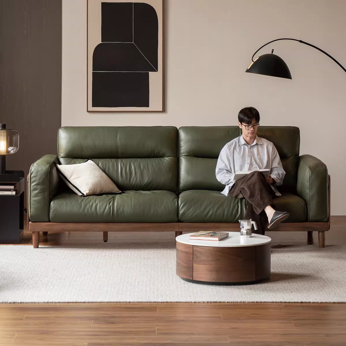源氏木语百伦沙实木沙发头层牛皮客厅现代简约胡桃色直排真皮沙发