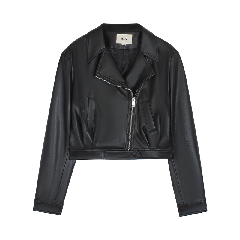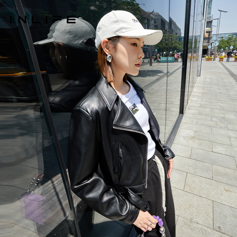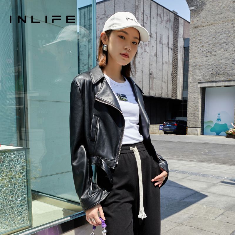 伊纳芙复古机车黑色皮衣秋季女新款经典短款皮夹克流行百搭外套