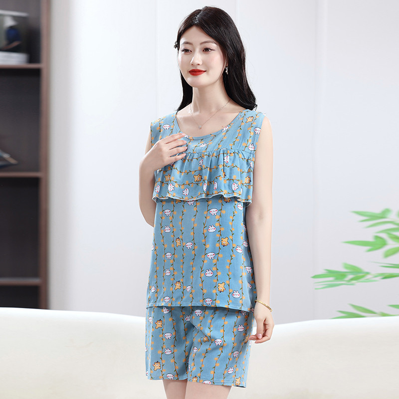 新款睡衣女夏季薄款棉绸无袖短裤套装宽松大码家居服防凸点两件套