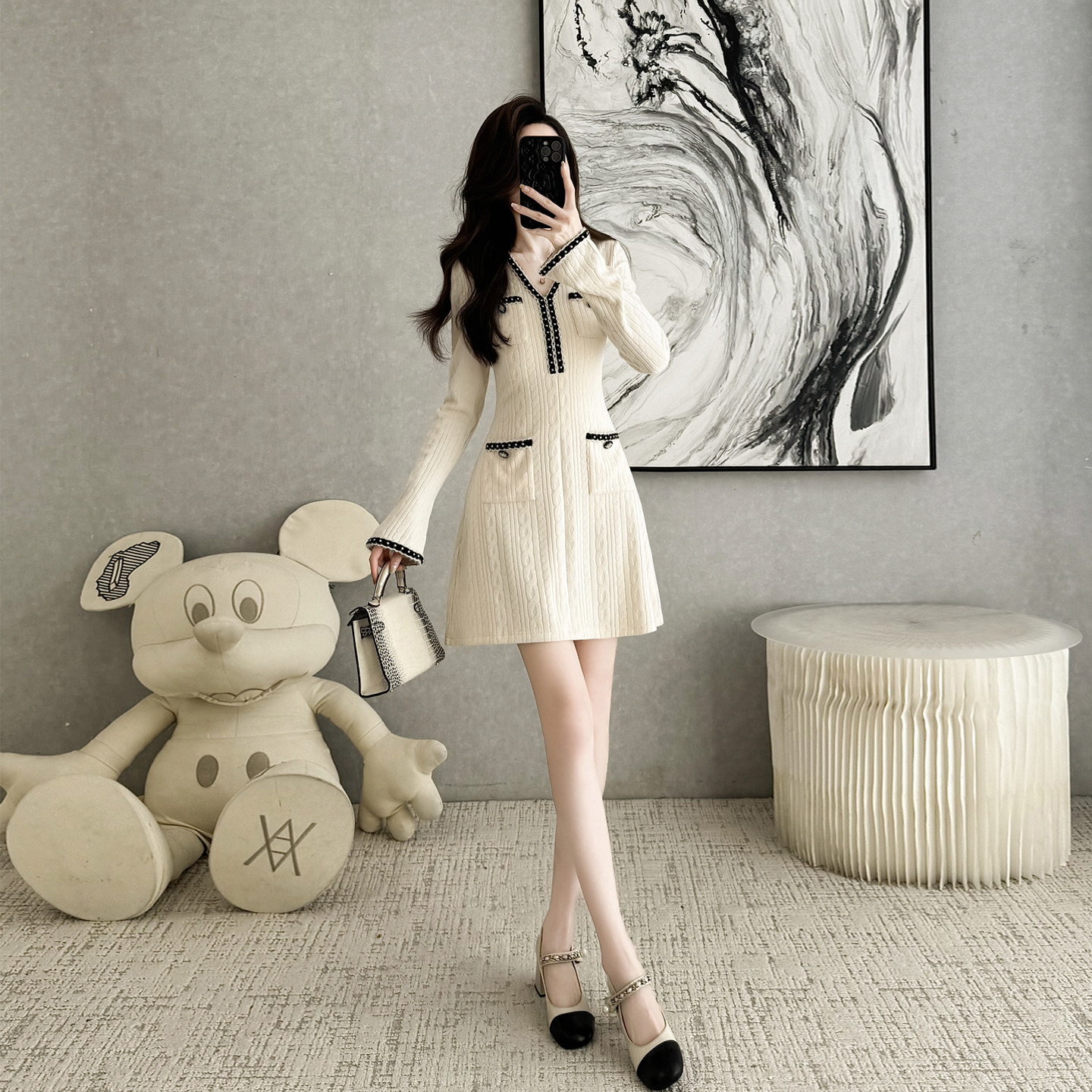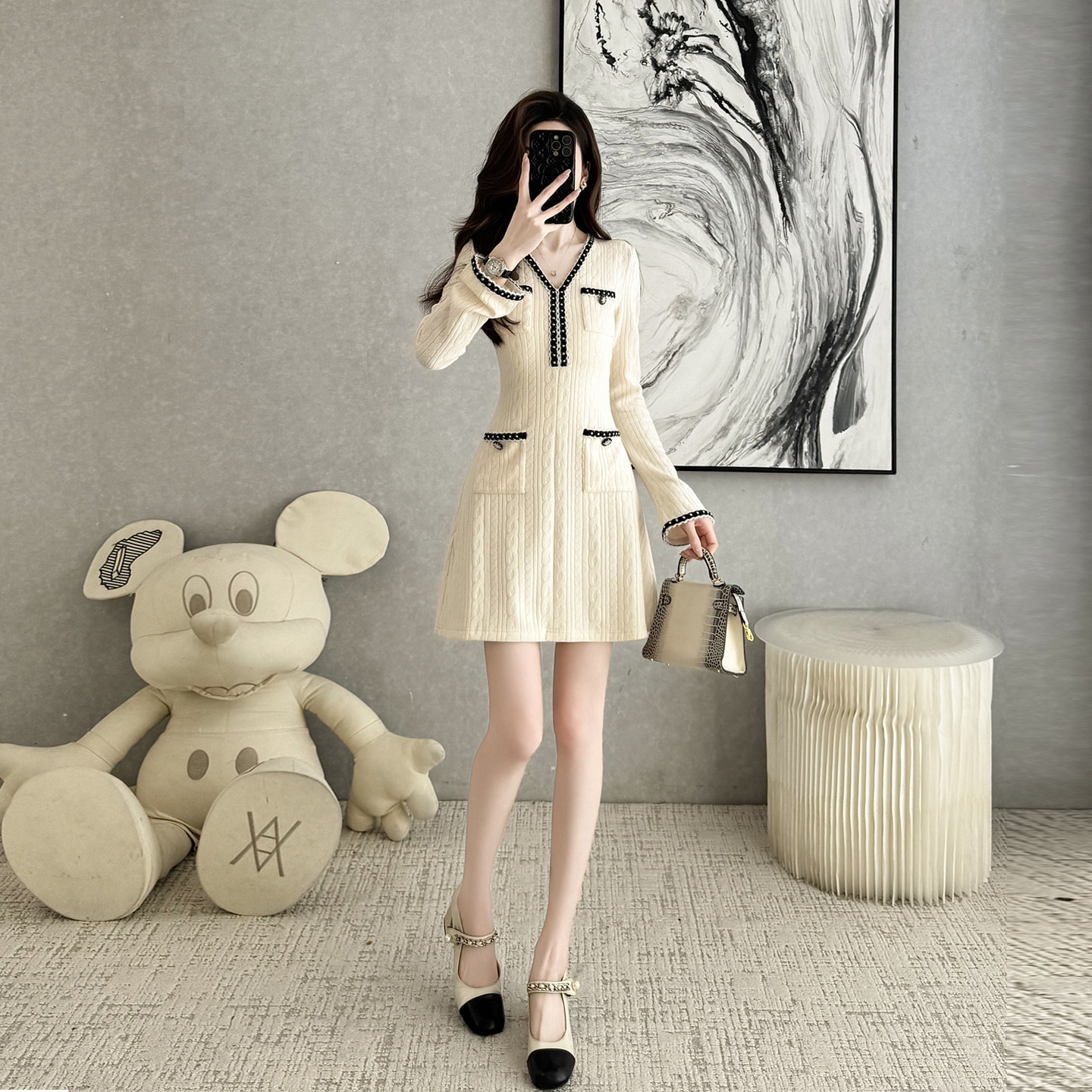 小香风钉珠缀饰V领针织连衣裙