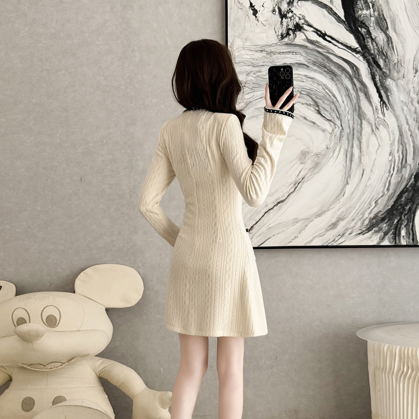 小香风钉珠缀饰V领长袖针织连衣裙女秋冬季轻奢优雅风修身短裙子