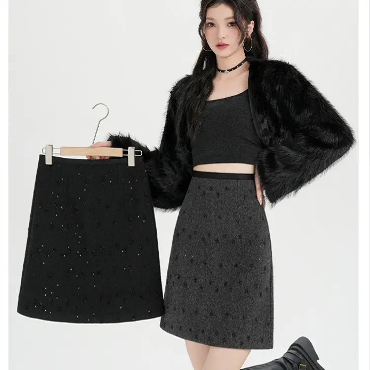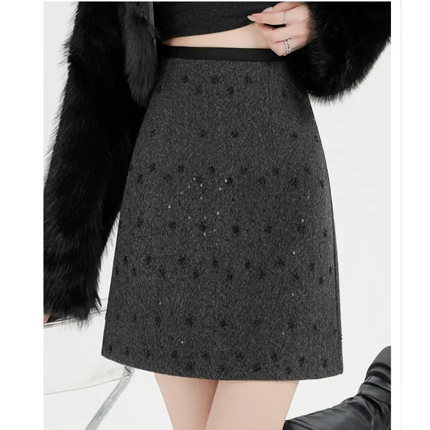 重工亮片毛呢半身裙秋冬新款大码加厚高腰气质显瘦包臀中裙A字裙