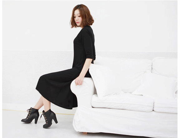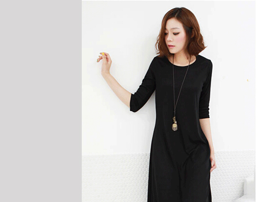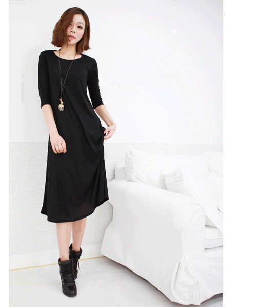 欧美风春秋装女莫代尔宽松A字裙七分袖中长裙大摆连衣裙大码小码