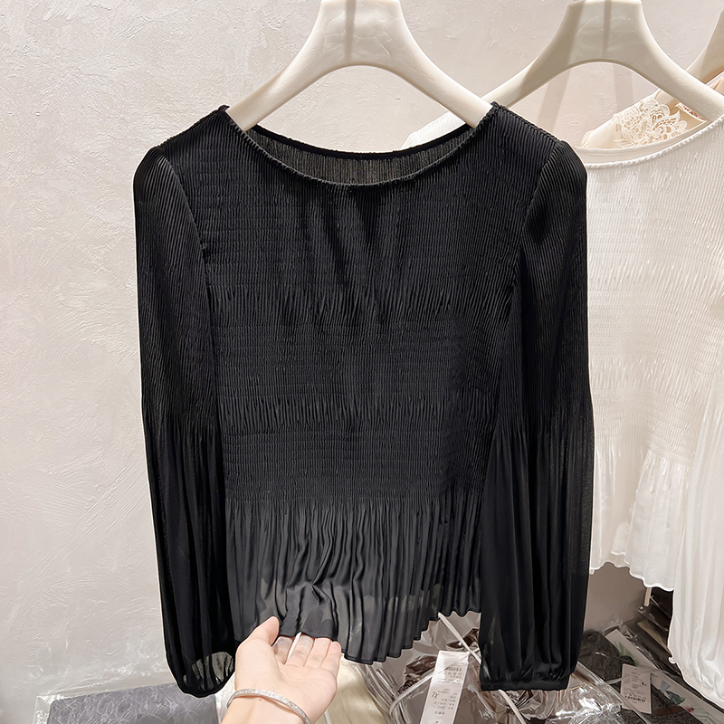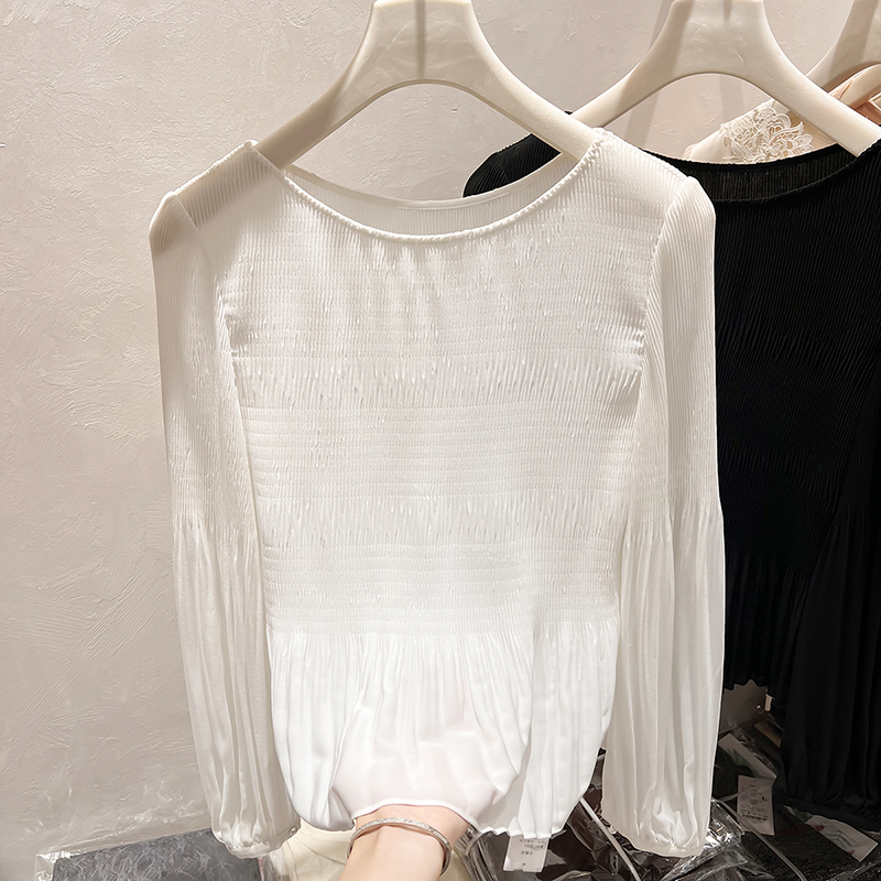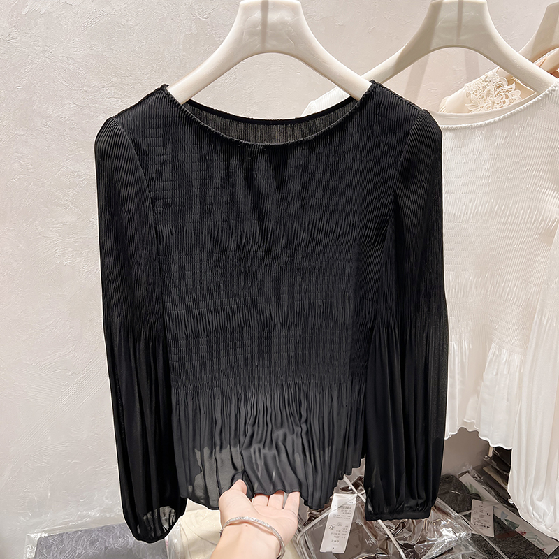 2025新款韩国气质显瘦圆领褶皱拼接纯色套头长袖雪纺衫女秋季