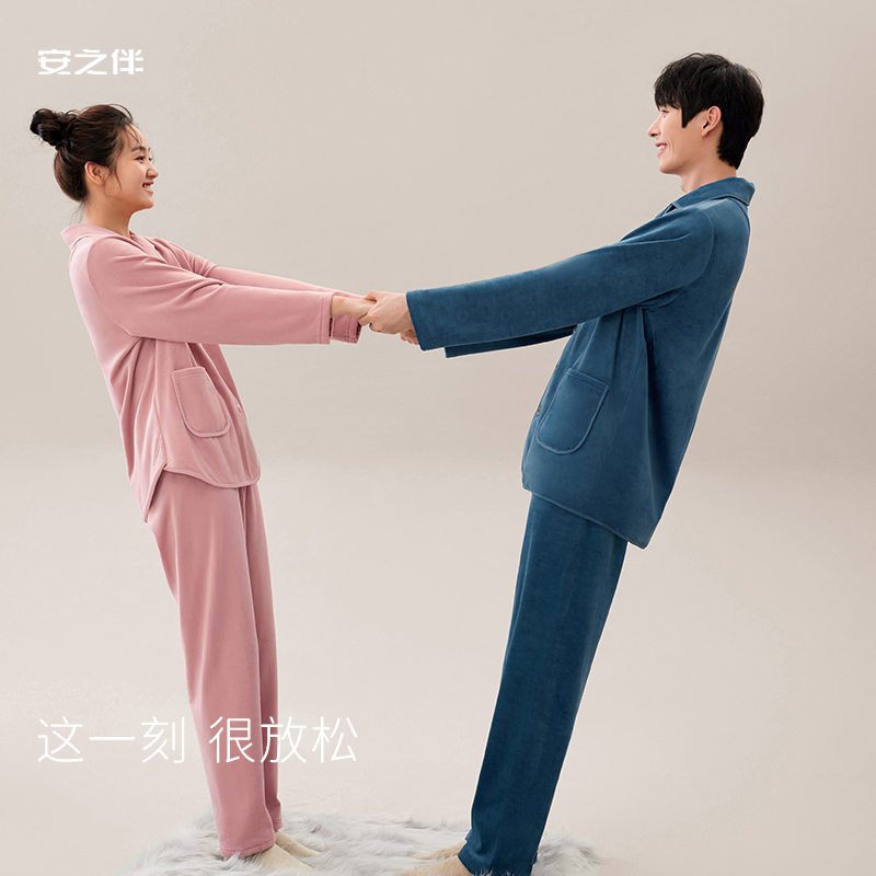 安之伴秋冬海岛绒锁温情侣睡衣女宽松简约长袖男士家居服两件套装
