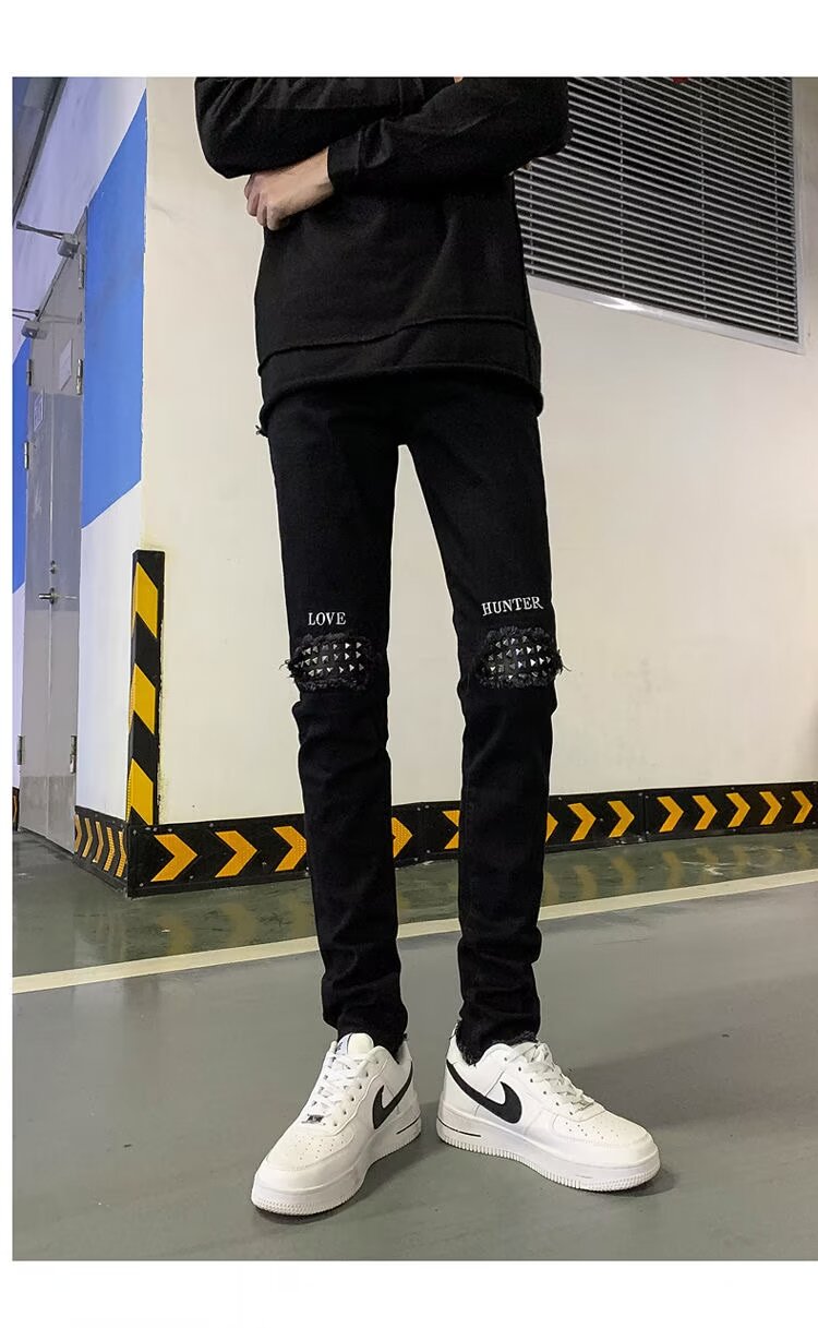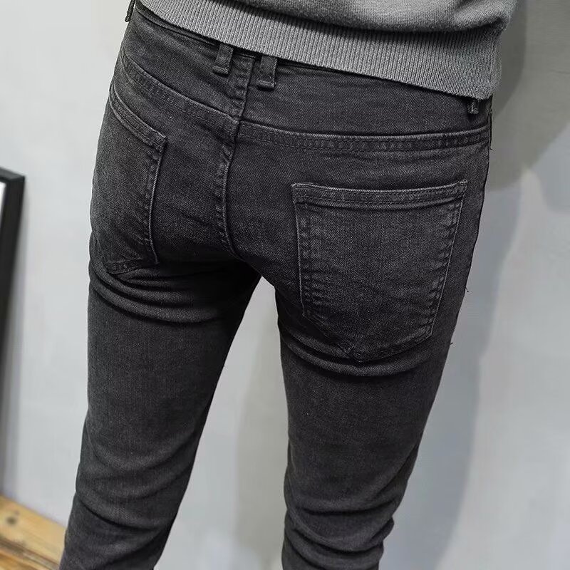欧洲站春季牛仔裤男士修身弹力小脚裤子个性拉链潮牌耐磨高端长裤