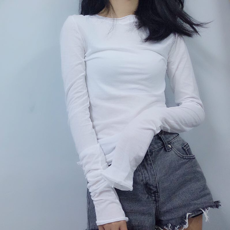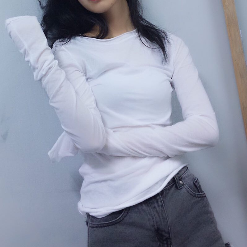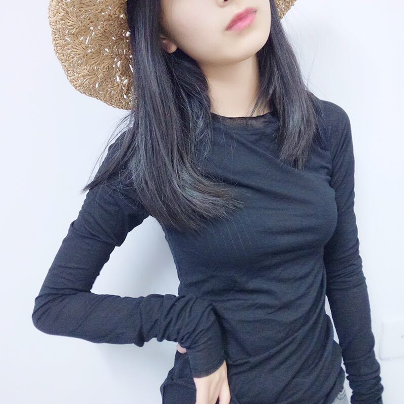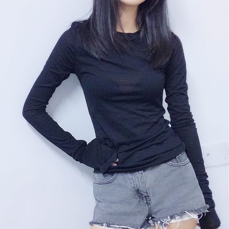 春秋复古港味chic百搭长袖薄款莫代尔性感微透紧身打底t恤上衣女