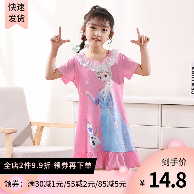 夏季儿童睡裙小女孩短袖薄款纯棉公主宝宝女童粉色睡衣卡通家居服