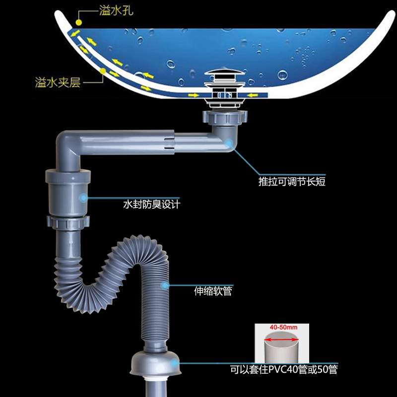 40螺口贴墙式浴室柜面盆下水管台盆脸盆短款下水器配件防臭省空间