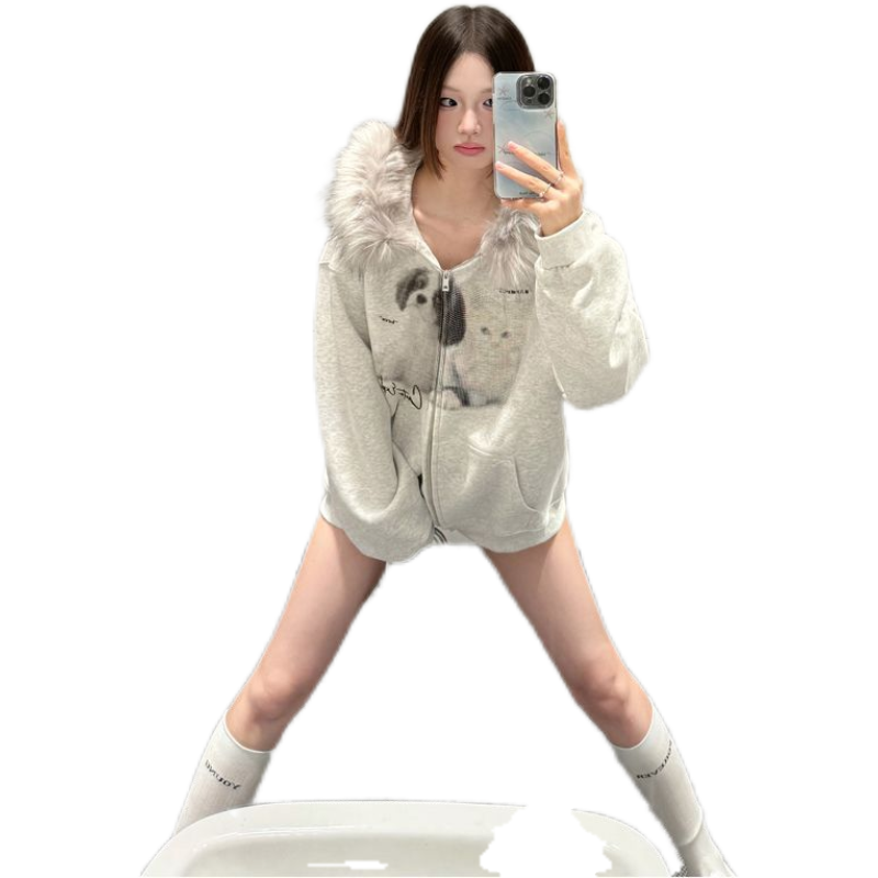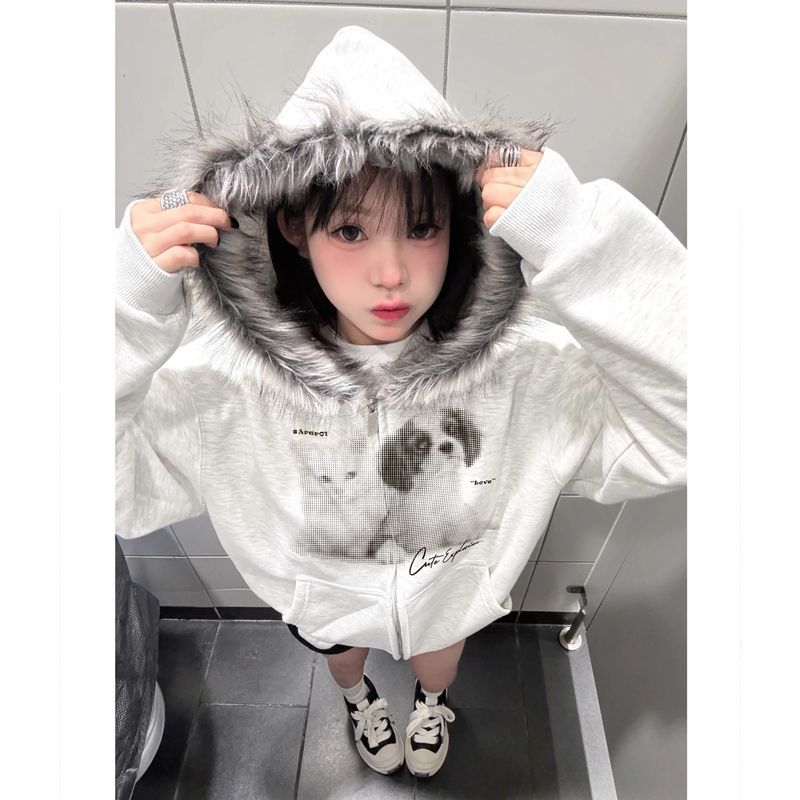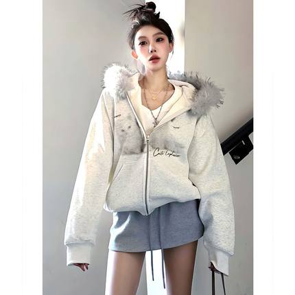 美式毛领慵懒设计感连帽卫衣重磅复古白灰色印花秋冬加绒开衫外套