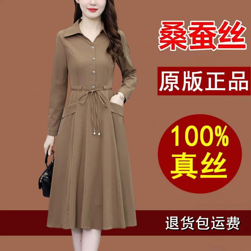 真丝长袖连衣裙女秋季2025年新款大码女装妈妈气质修身桑蚕丝裙子