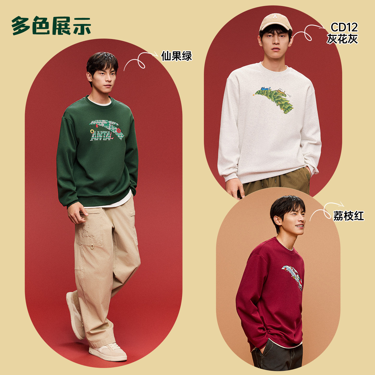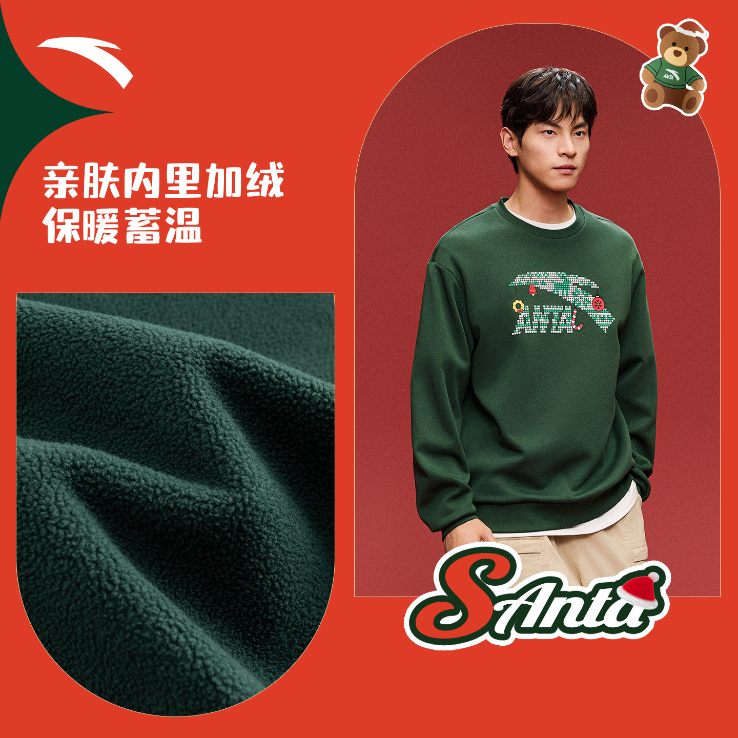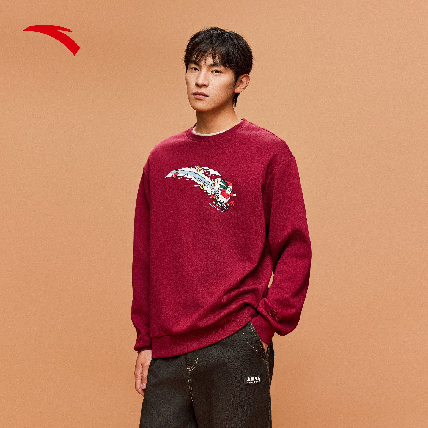 安踏新年款情侣加绒套头卫衣男女冬季趣味印花长袖休闲运动服上衣