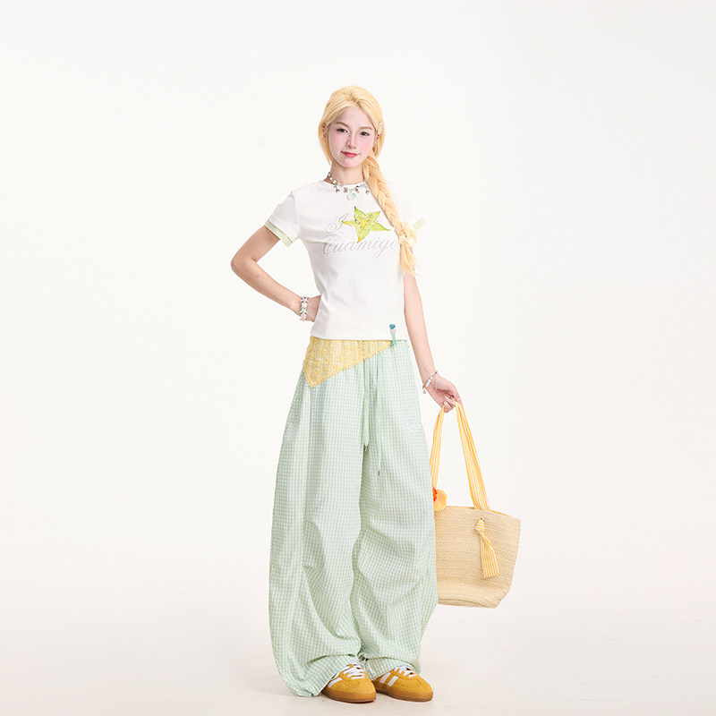 NERESUM杨桃印花格纹拼接短袖