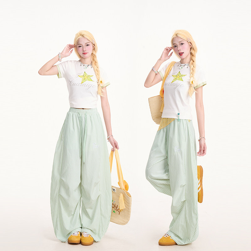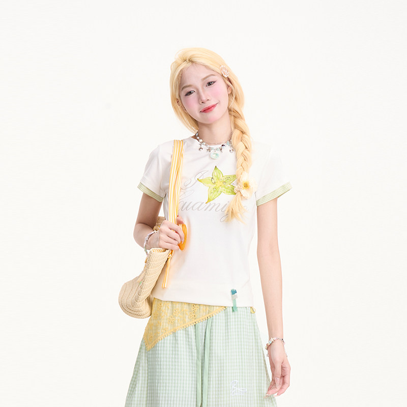 NERESUM杨桃印花假两件短袖T恤女格纹拼接设计感小众百搭短款上衣