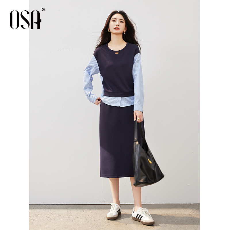 OSA欧莎假两件条纹衬衫拼接套装女秋季新款高级感上衣半裙两件套