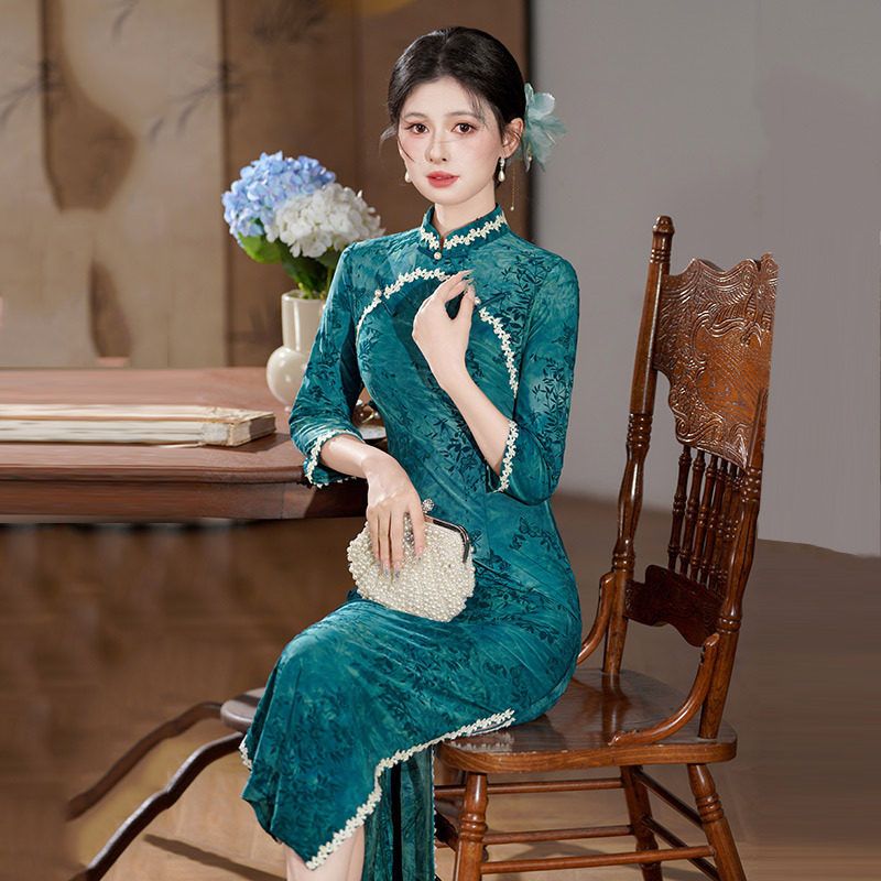爱旗长袖长款款女春秋装绿色修身国风收腰复古年轻新中式旗袍改良