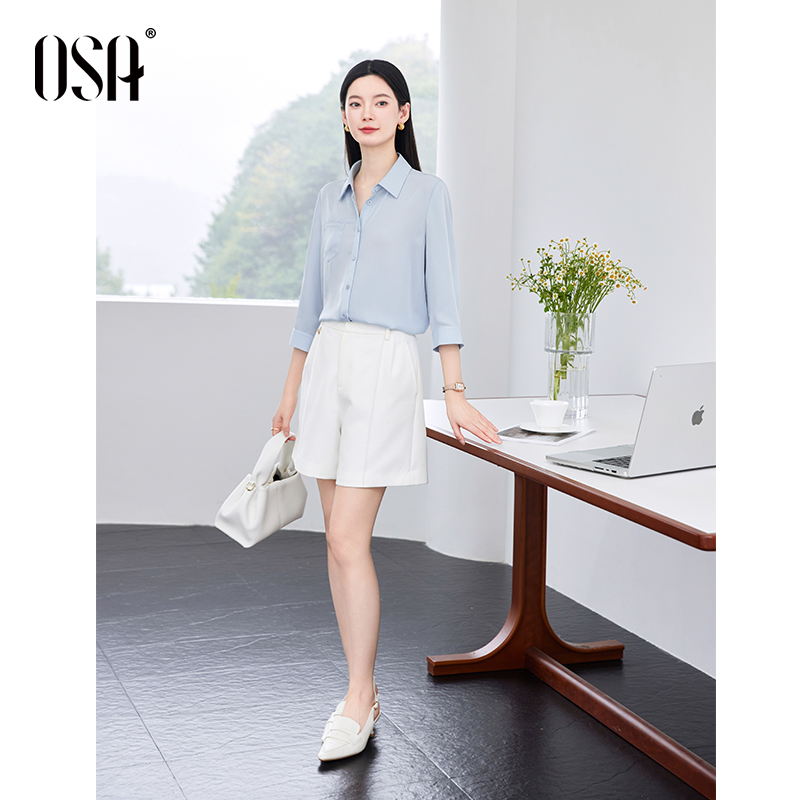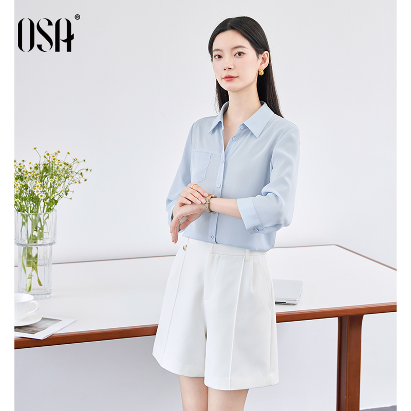 OSA欧莎法式七分袖蓝衬衫女上衣夏季2025新款宽松基础款百搭衬衣