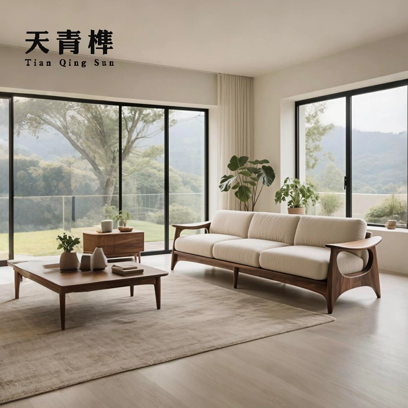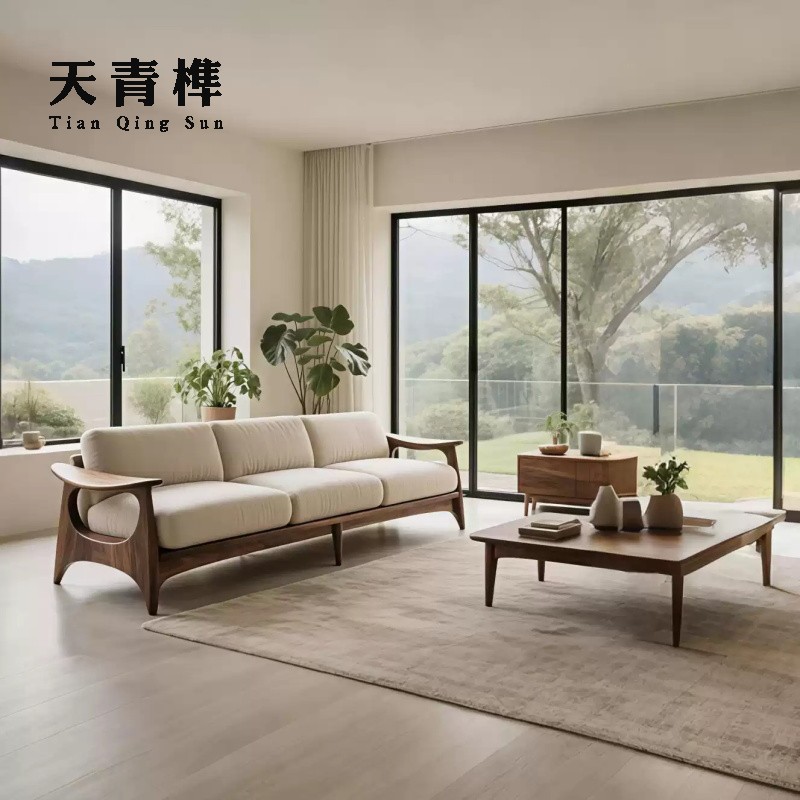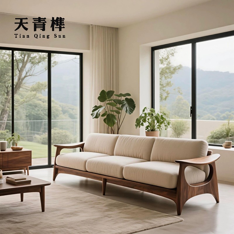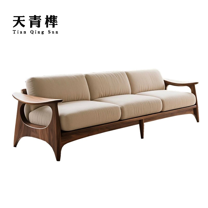 宋式美学北美黑胡桃木实木直排沙发中古风客厅高端三人位沙发定制