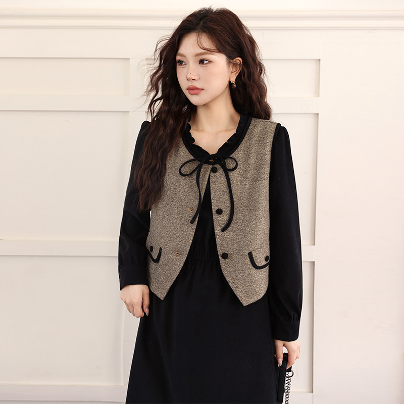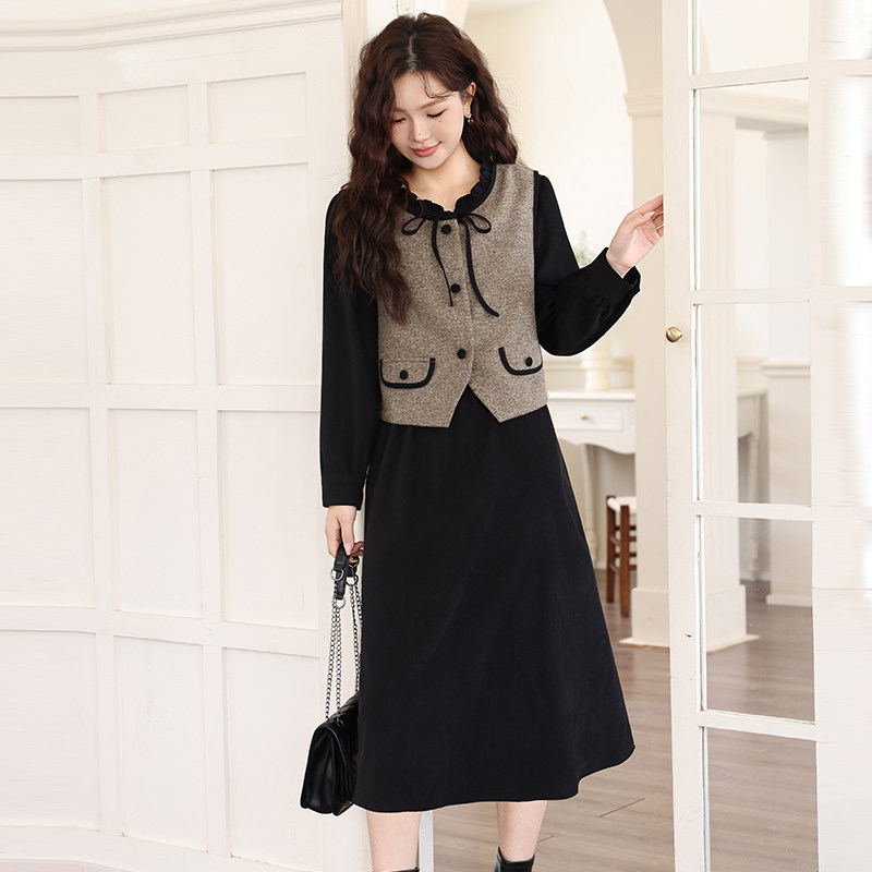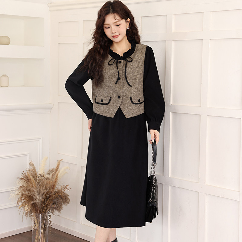 绮娑大码两件套装连衣裙冬季新款收腰遮肚子显瘦胖MM磨毛A字长裙