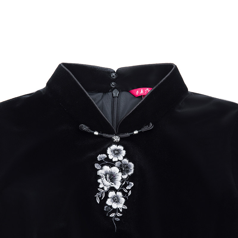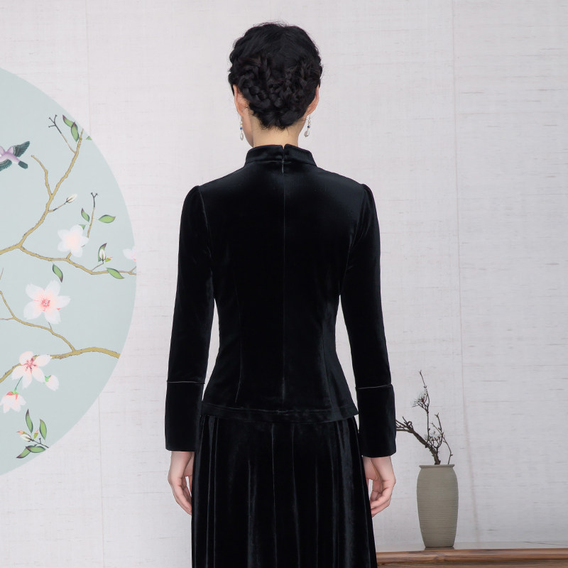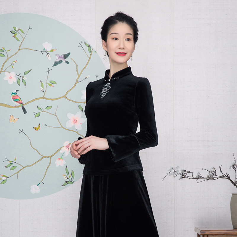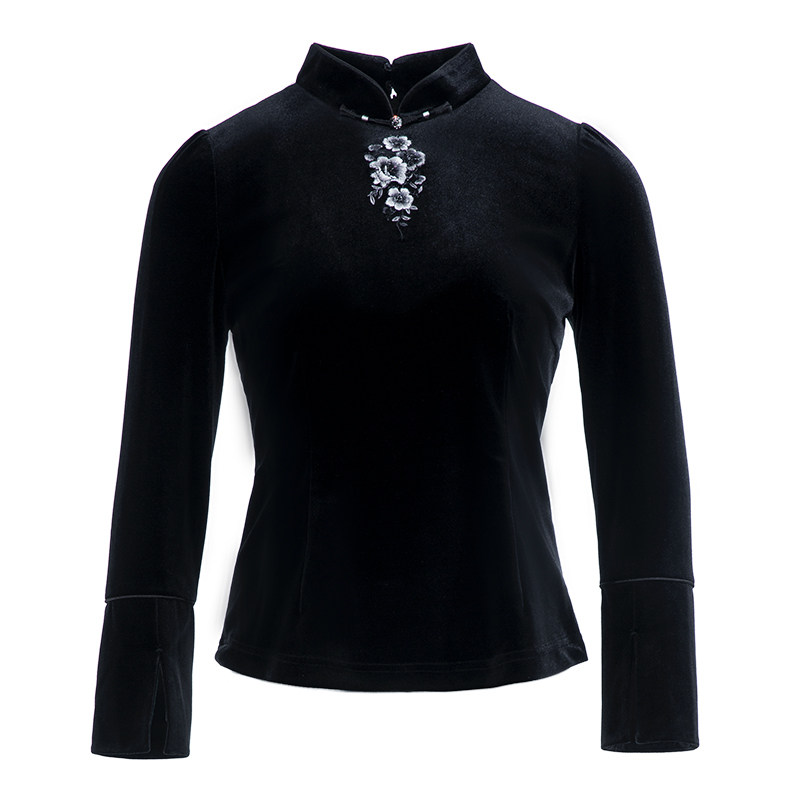 木真了弹力丝绒打底衫女装中式蔷薇花刺绣日常新品唐装短上衣906