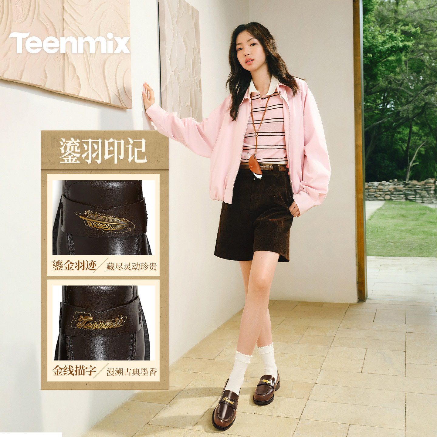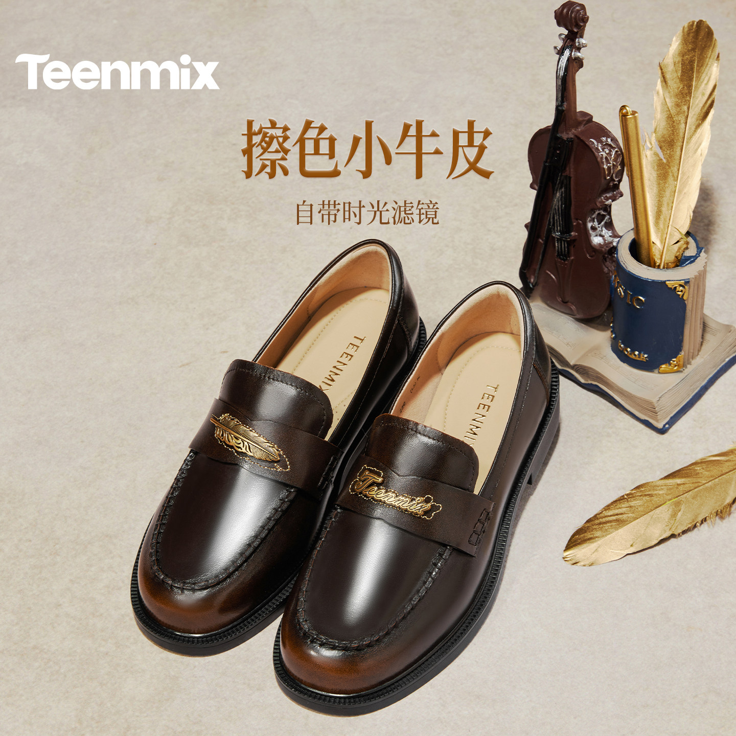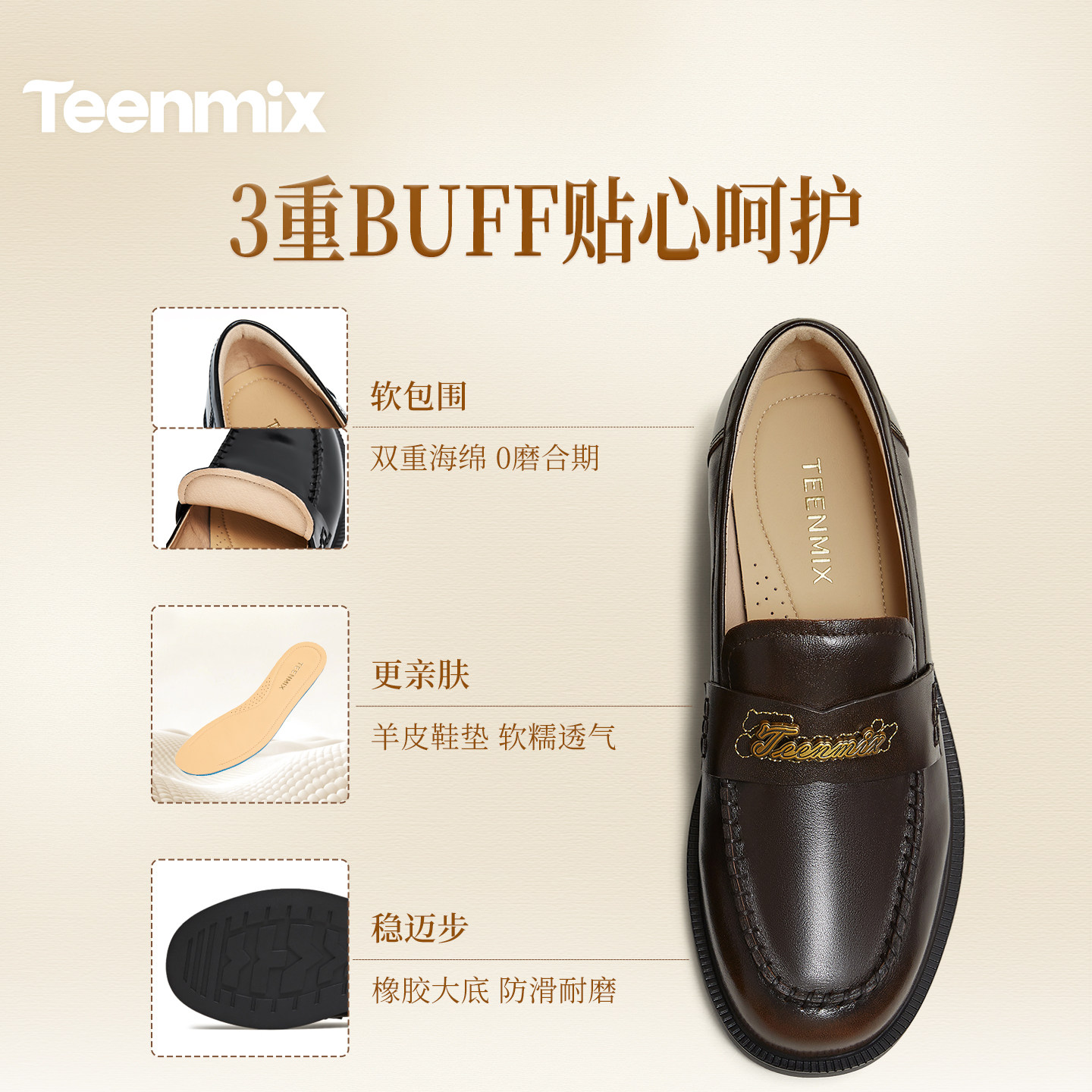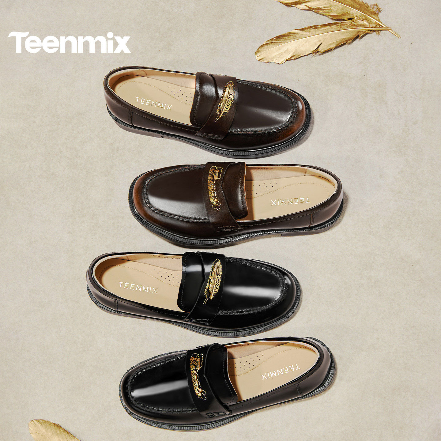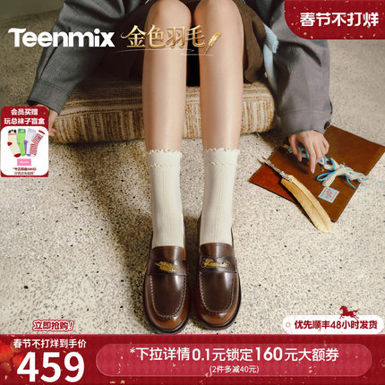 天美意金色羽毛平底英伦常青藤乐福鞋女软底小皮鞋单鞋2026春新款