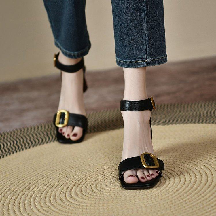 2025夏季新款真皮粗跟复古露趾凉鞋女夏天一字式罗马百搭高跟女鞋