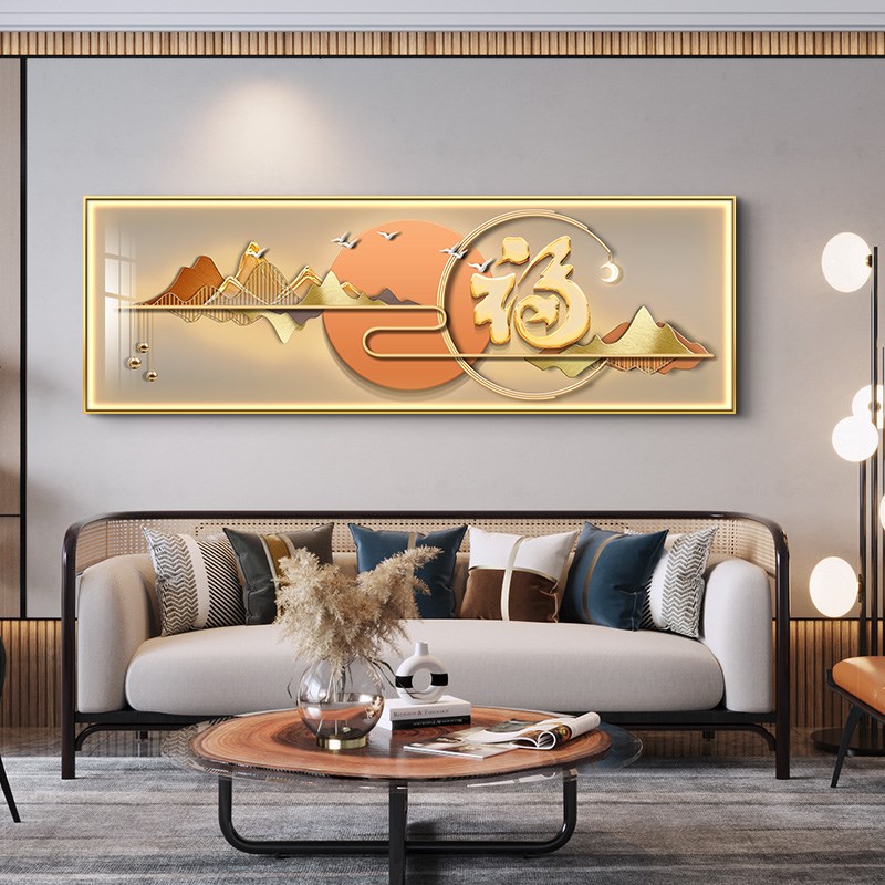 现代轻奢山水麋鹿沙发背景墙装饰画福字寓意好大气壁画客厅挂画