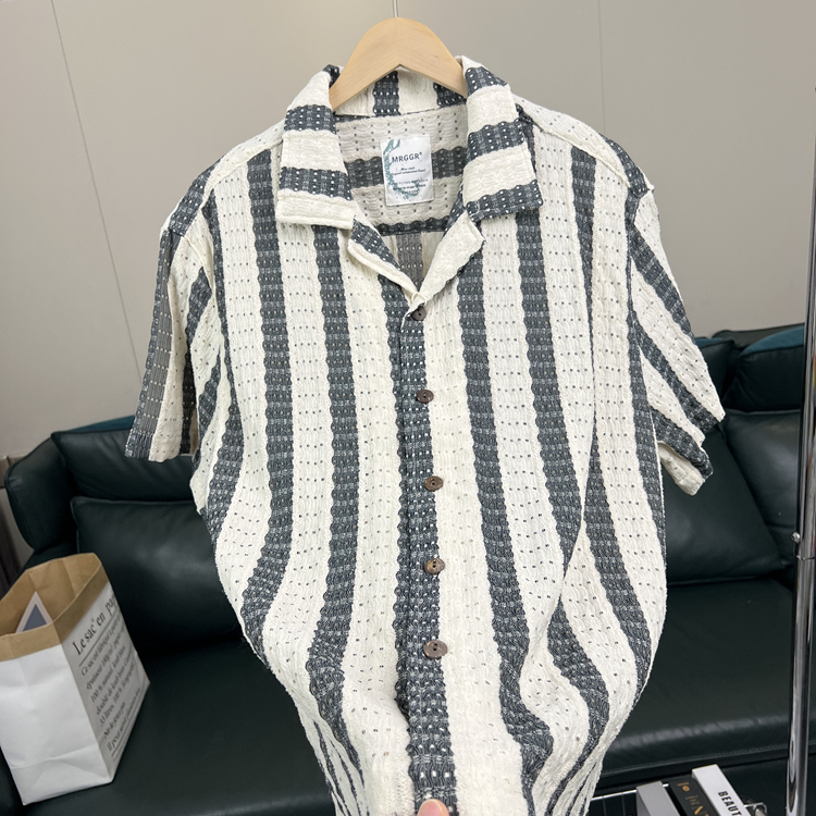 小众设计!复古条纹!外贸男装夏季情侣宽松休闲百搭镂空短袖衬衫