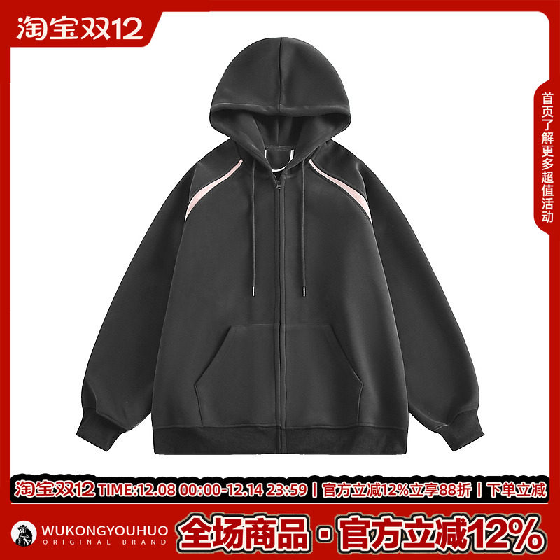悟空有货复古潮牌撞色拼接开衫连帽卫衣男女秋季宽松慵懒开衫外套
