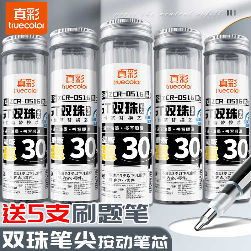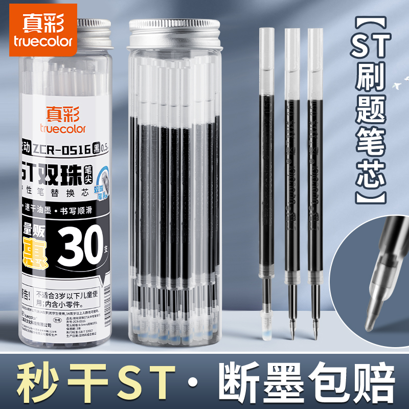 真彩双珠st按动笔芯中性笔芯顺滑速干黑色0.5mm葫芦头桶装可替换碳素笔签字水笔学生考试专用刷题笔替芯批发