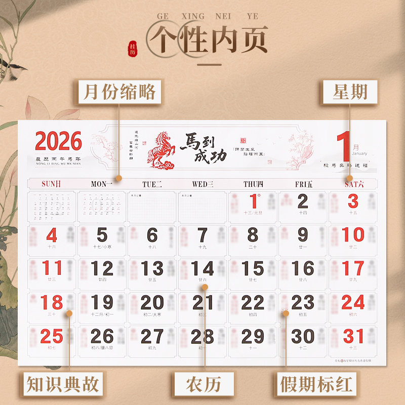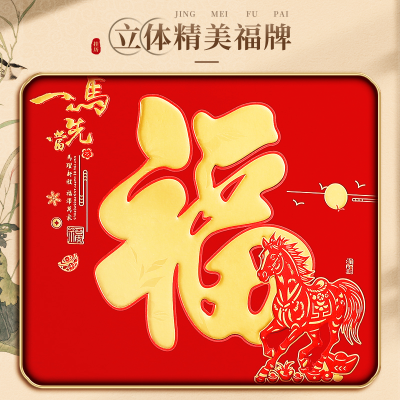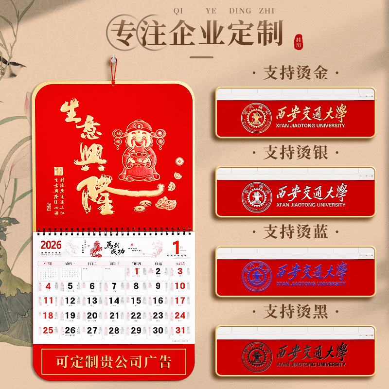 挂历2026年新款马年中国红立体清晰福字日历精美浮雕烫金工艺家用挂墙自带丝绸挂绳月历装饰企业广告定制logo