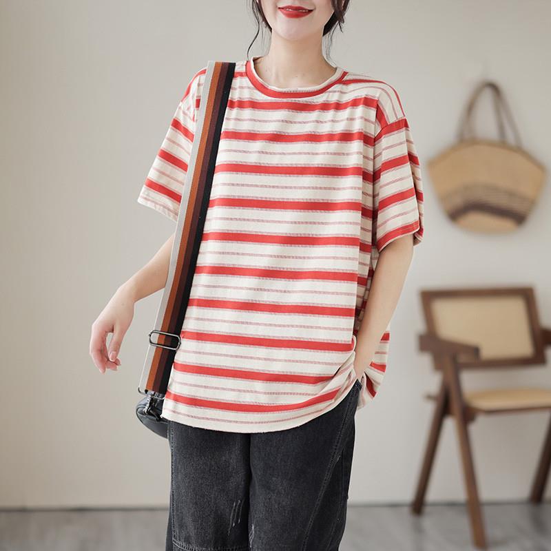 港风复古撞色条纹短袖t恤女夏季宽松大码遮肚显瘦半袖体恤上衣潮