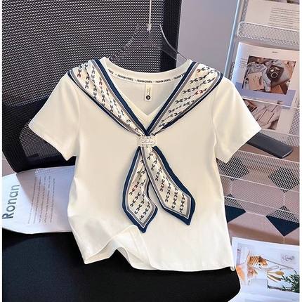 2025夏季新款丝巾拼接V领短袖正肩t恤女别致修身显瘦短款系带上衣