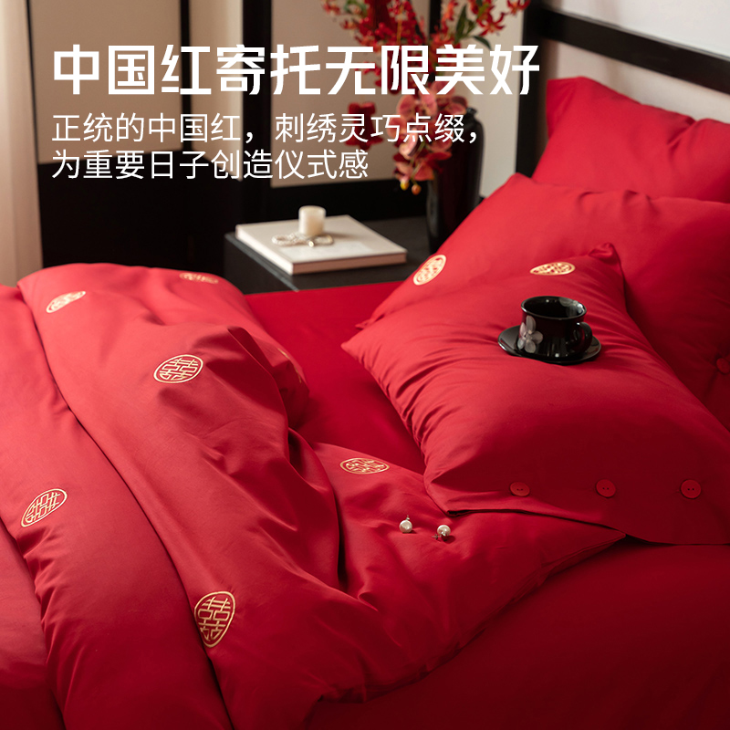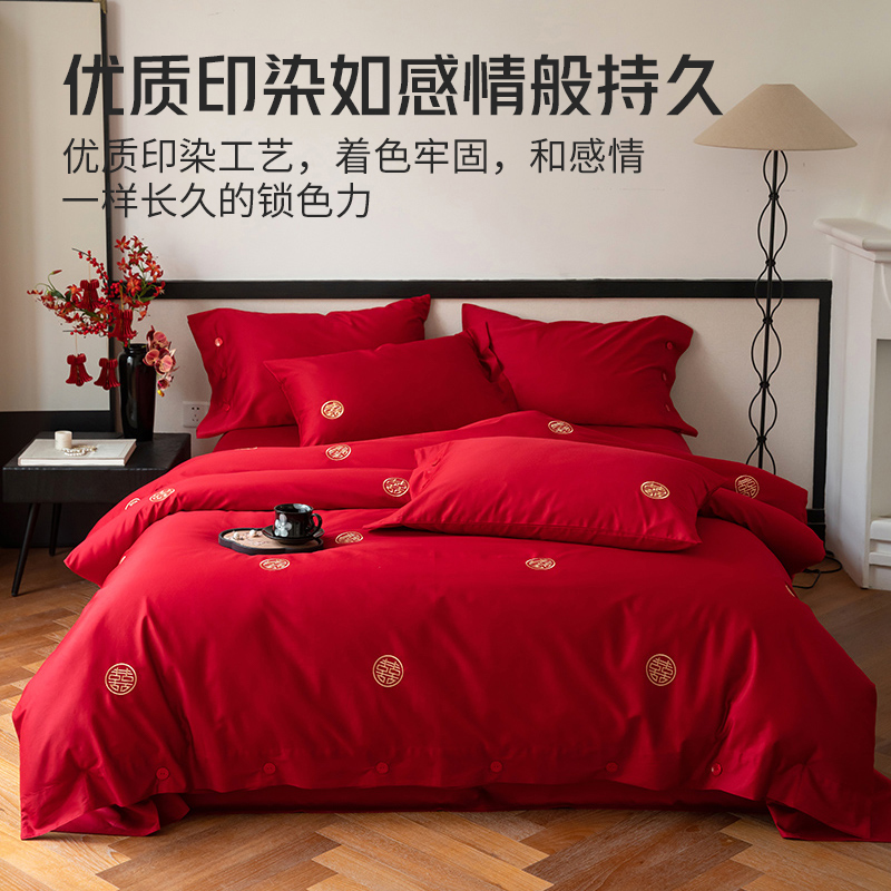 无印良品100%婚庆喜字刺绣全棉四件套喜庆纯棉大红色结婚床上用品