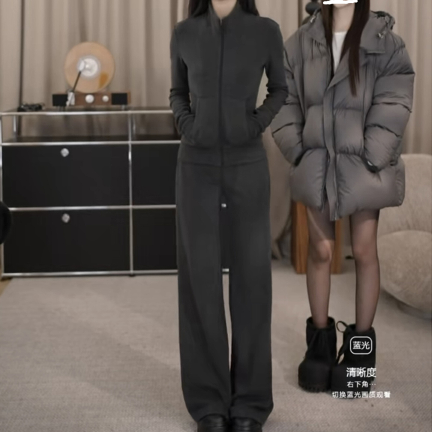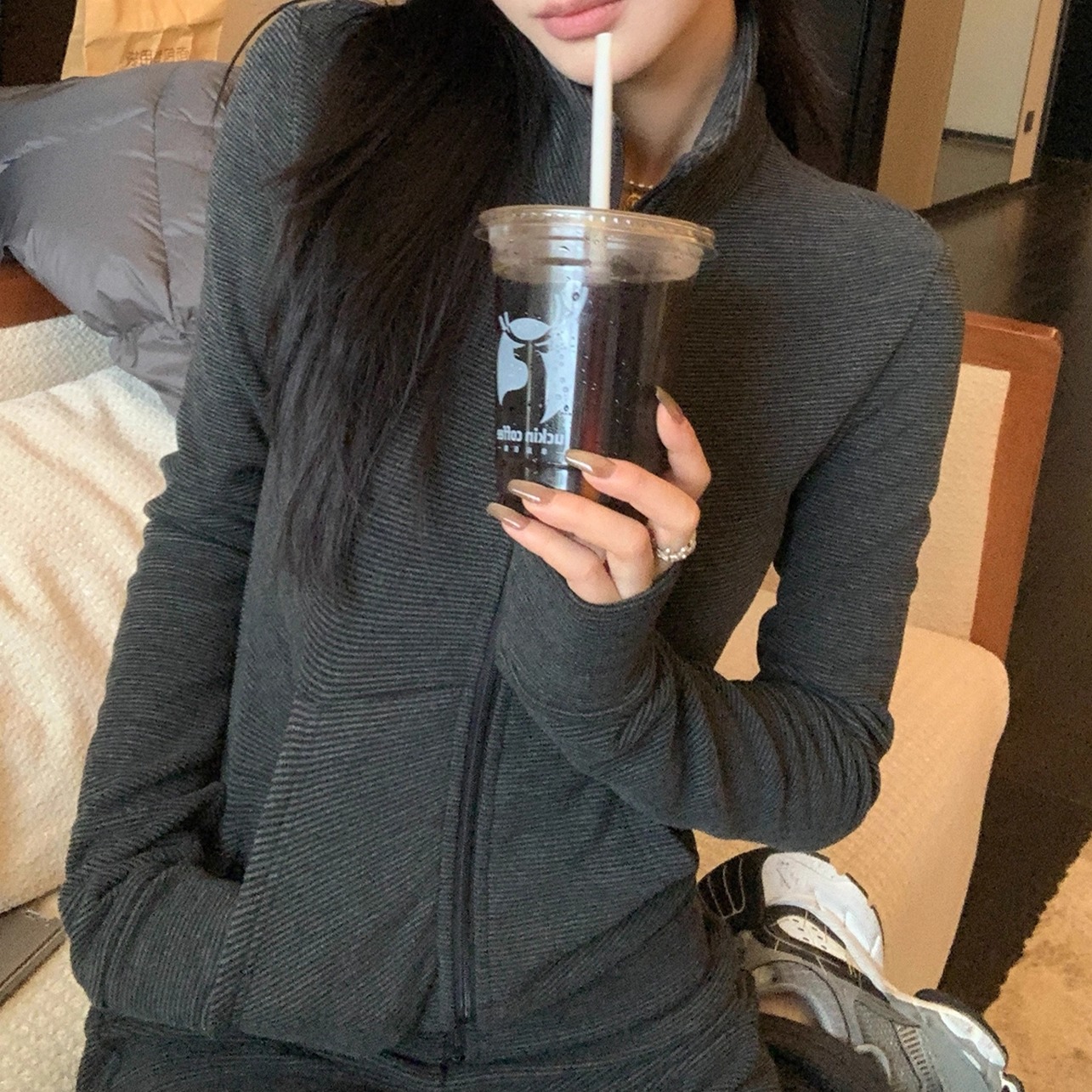 2025年秋季套装女深灰色一体绒条纹修身显瘦拉链外套阔腿裤两件套