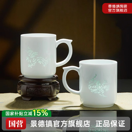景德镇官方陶瓷龙凤玲珑马克杯高温白瓷大容量家用喝水杯子礼盒装