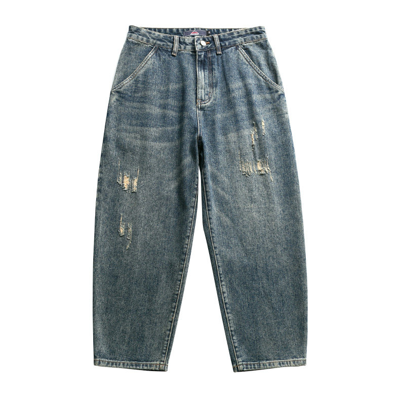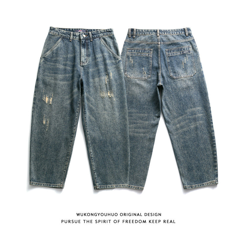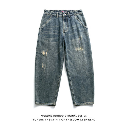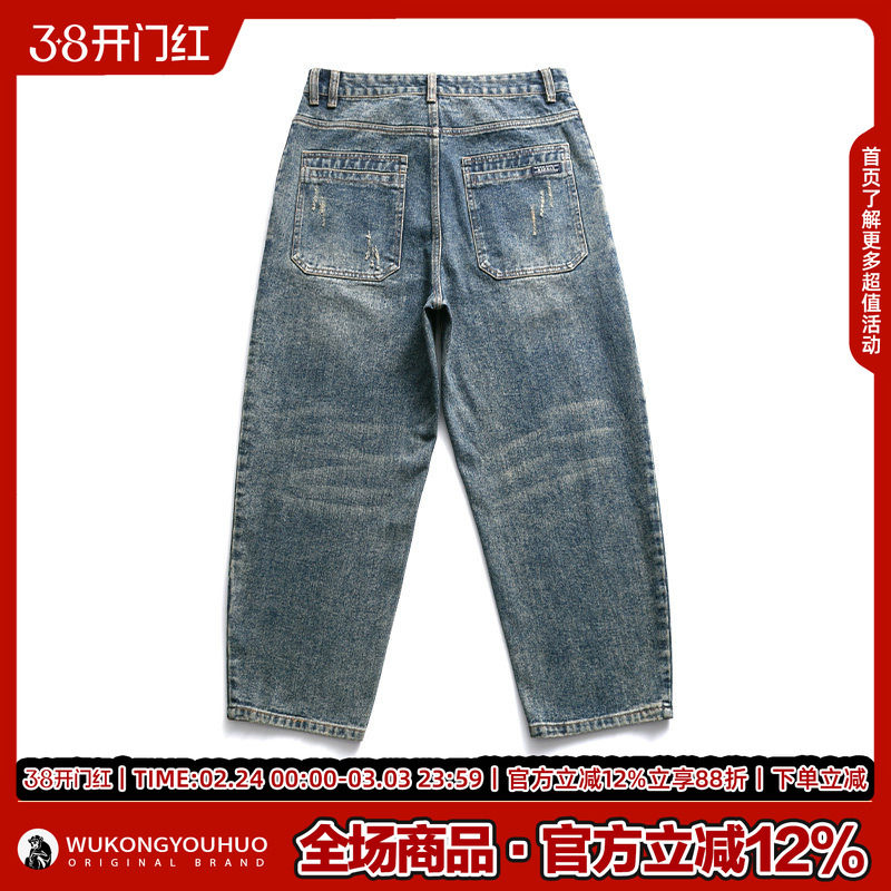 悟空有货秋新款美式复古做旧破洞直筒牛仔裤男潮牌宽松水洗休闲裤