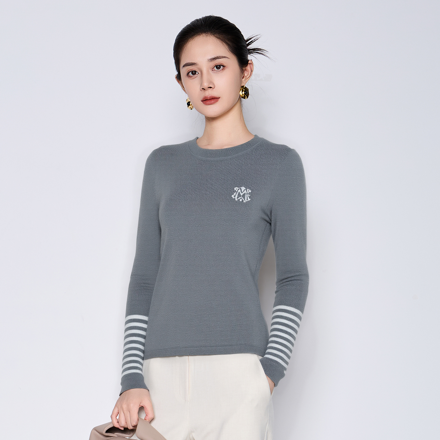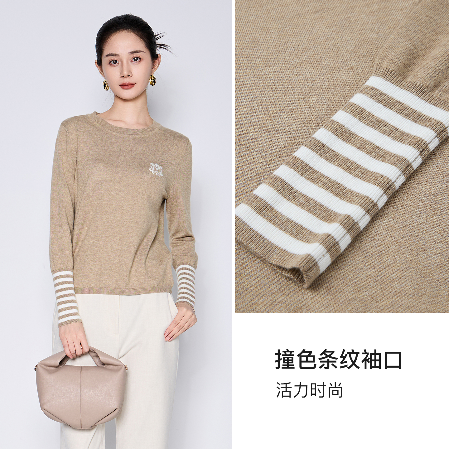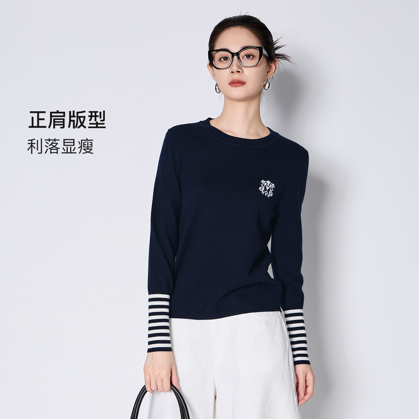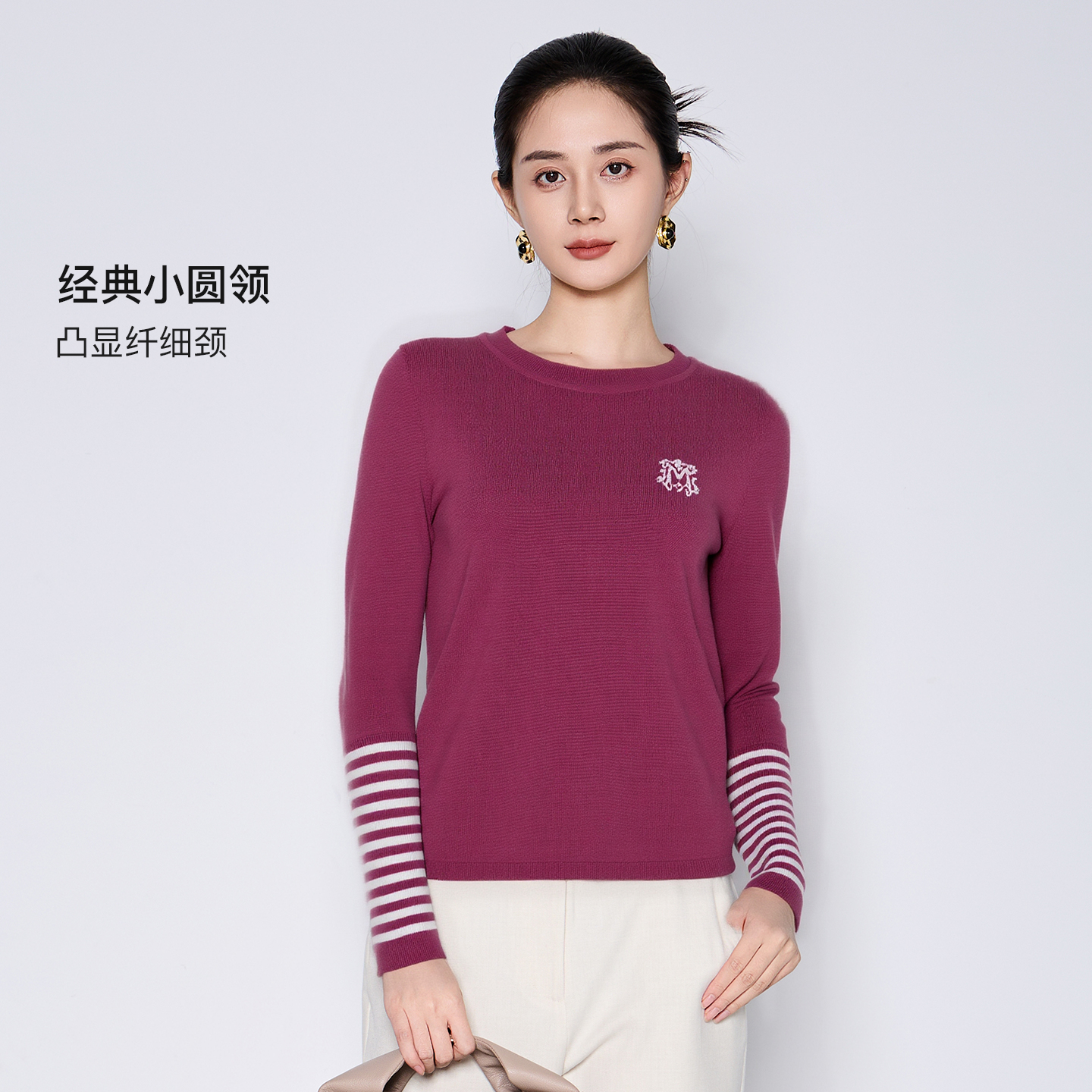马天奴2025秋冬新款纯色圆领修身针织衫撞色条纹毛衫毛衣百搭时尚