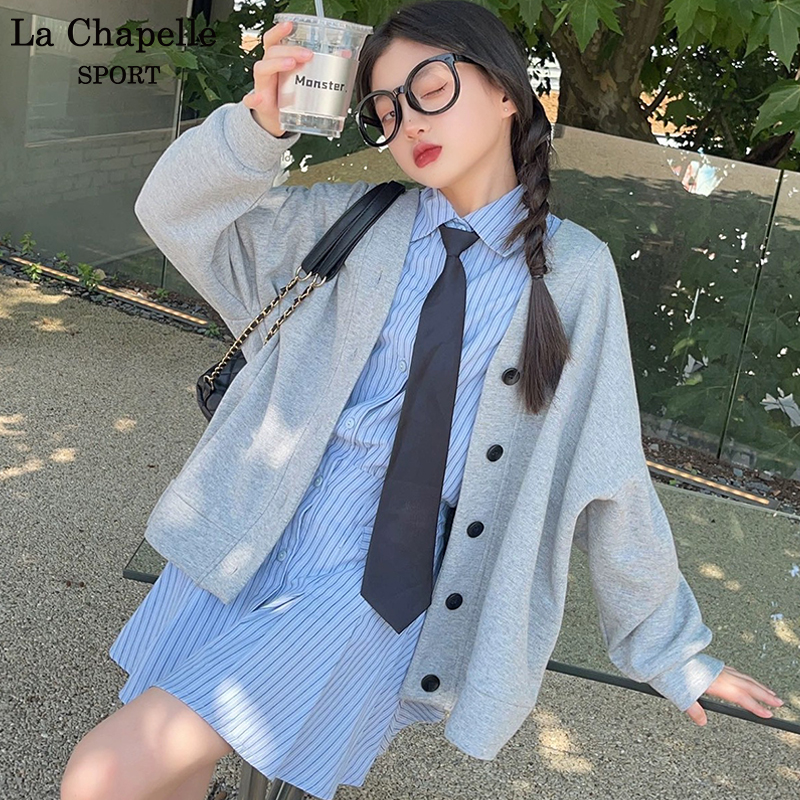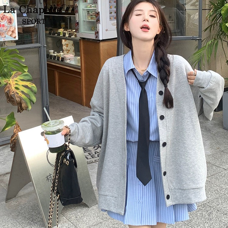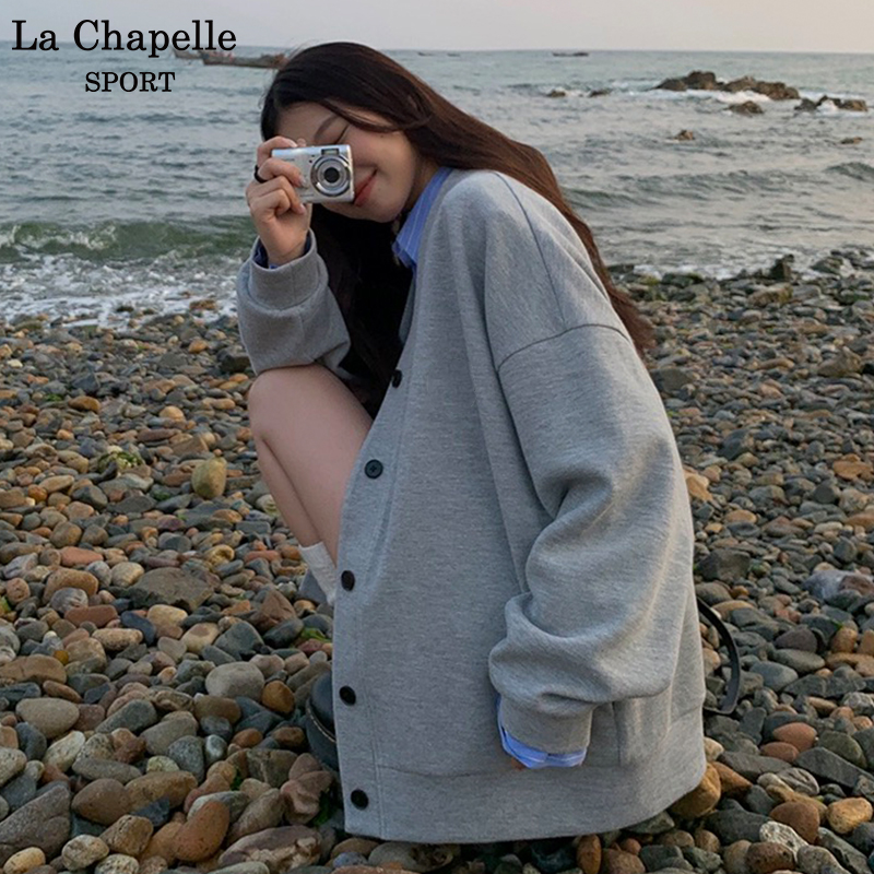 拉夏贝尔外套女秋季2025新款巨好看的早秋棒球服灰色v领开衫卫衣X