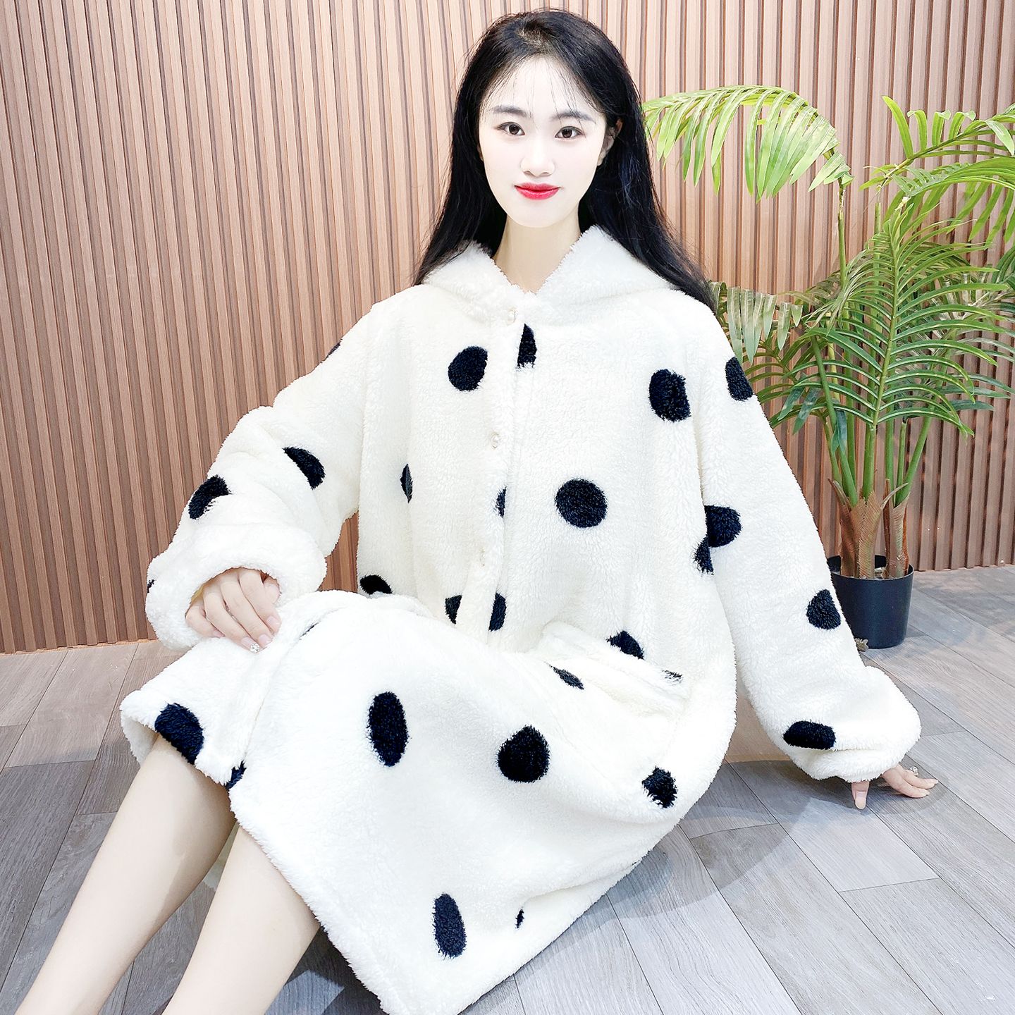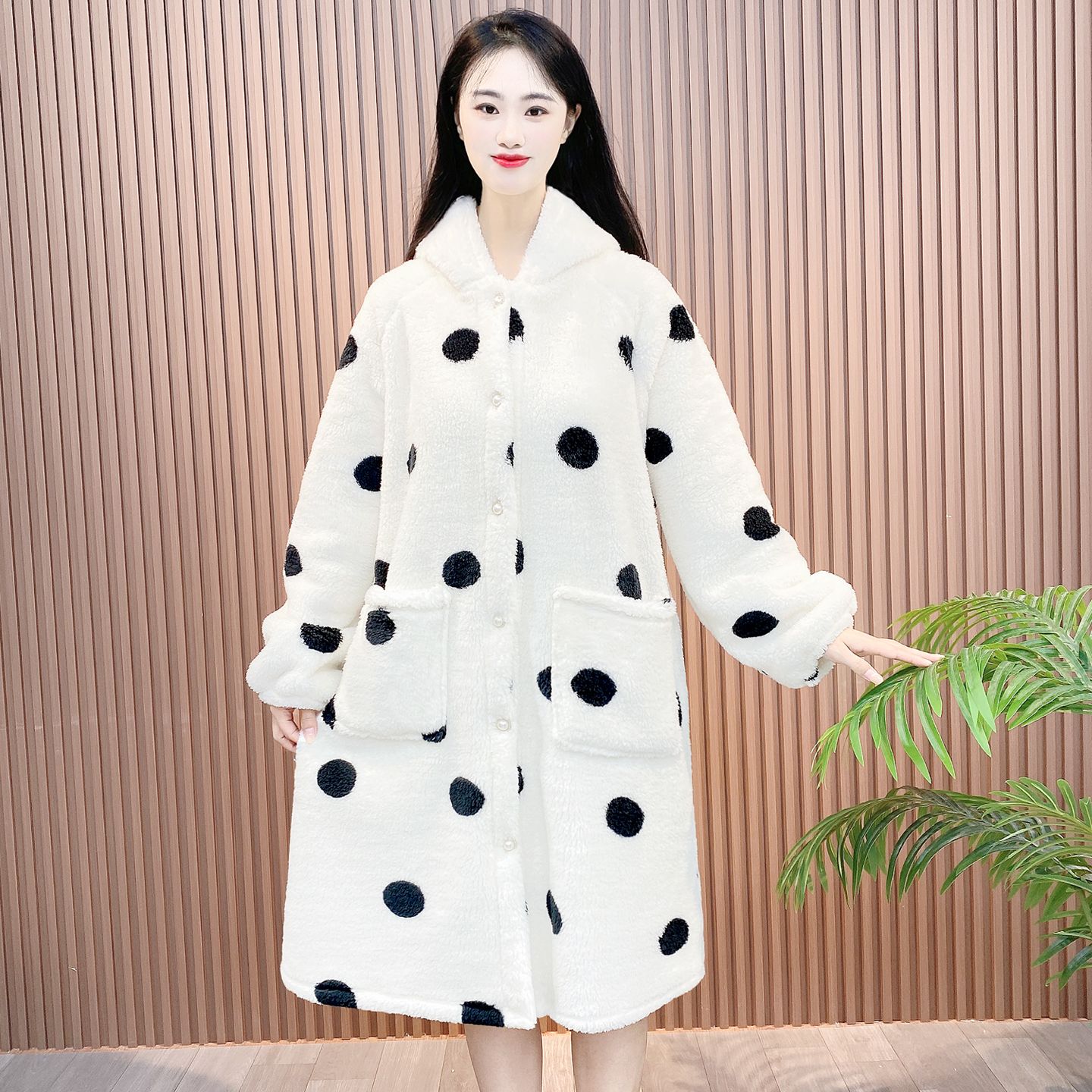 冬季长款睡袍女加厚2025新款珊瑚绒毛绒连帽可外穿加绒睡衣家居服