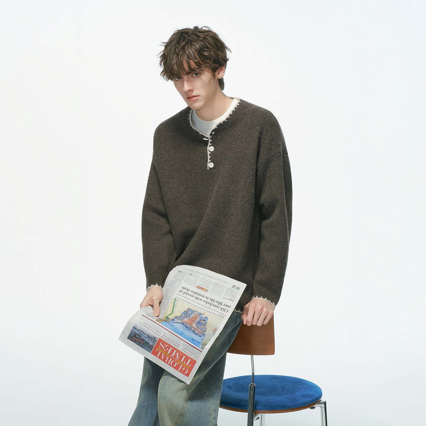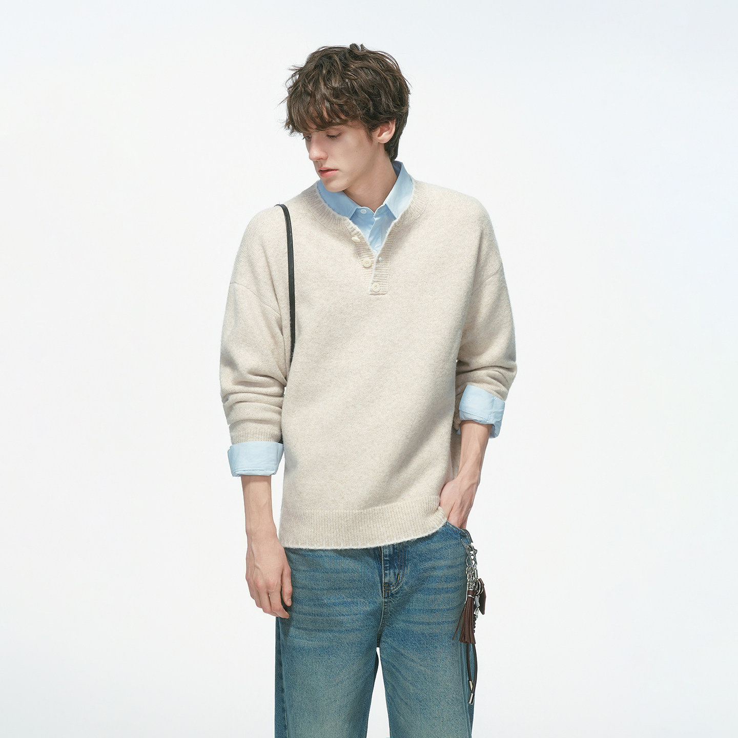 Dream made 手缝线亨利领羊毛混纺毛衣男秋冬季内搭老钱风针织衫