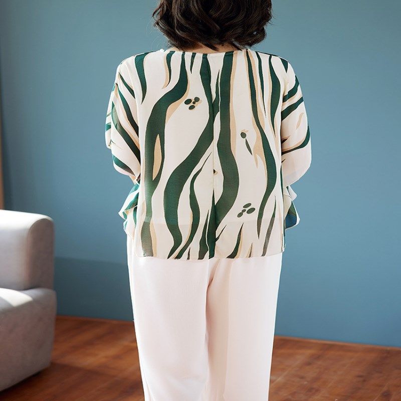 母亲节妈妈夏季雪纺上衣中年女装夏装休闲大码中老年短袖T恤套装