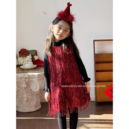 YFY秋冬女童红色流苏裙闪闪公主裙拜年服喜庆过年背心裙连衣裙