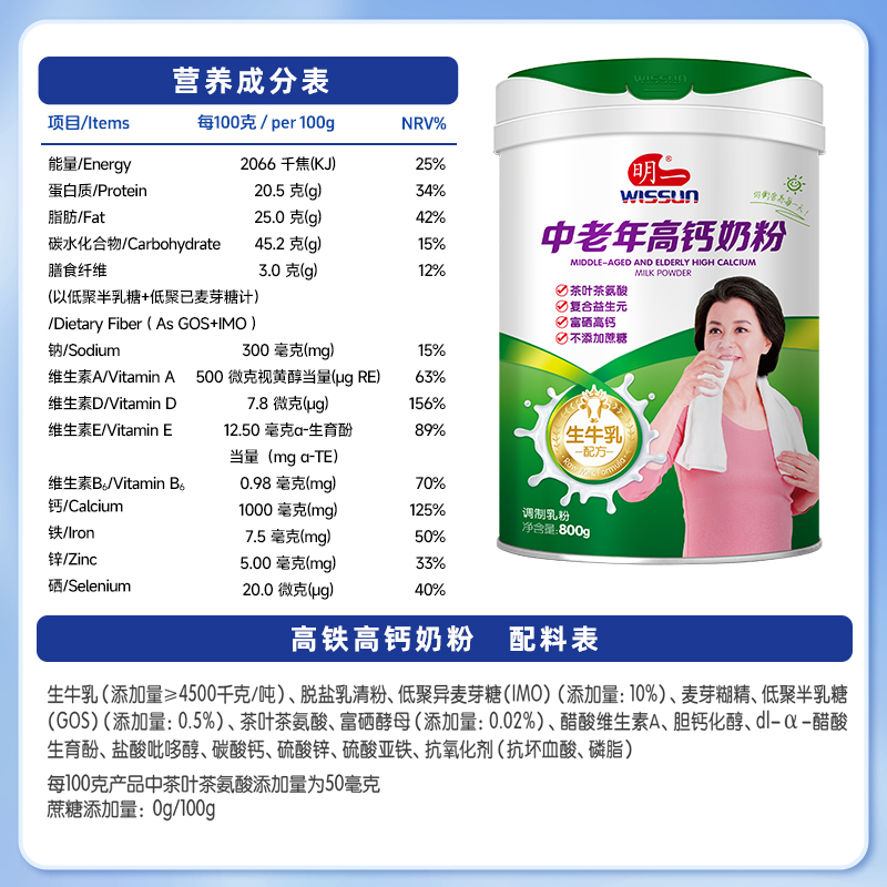 明一奶粉中老年高钙奶粉800g罐装不添加蔗糖过节送礼营养品健康