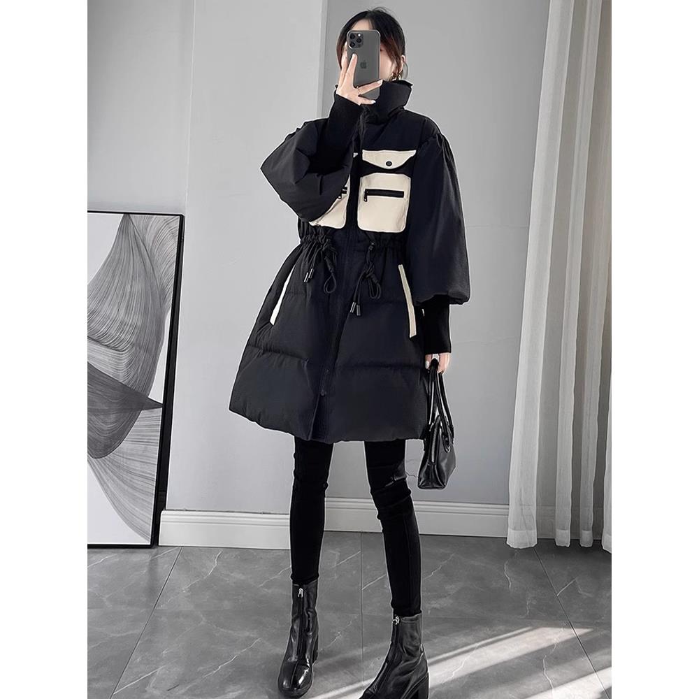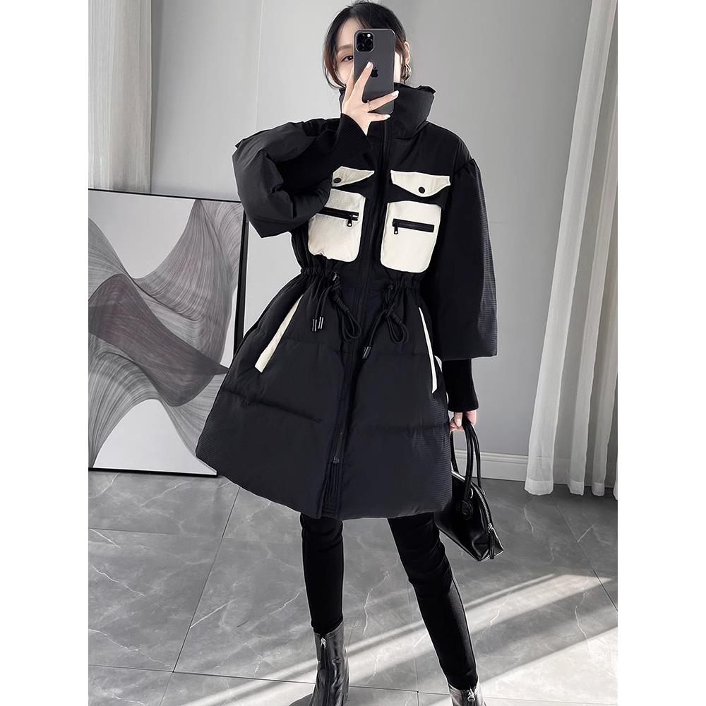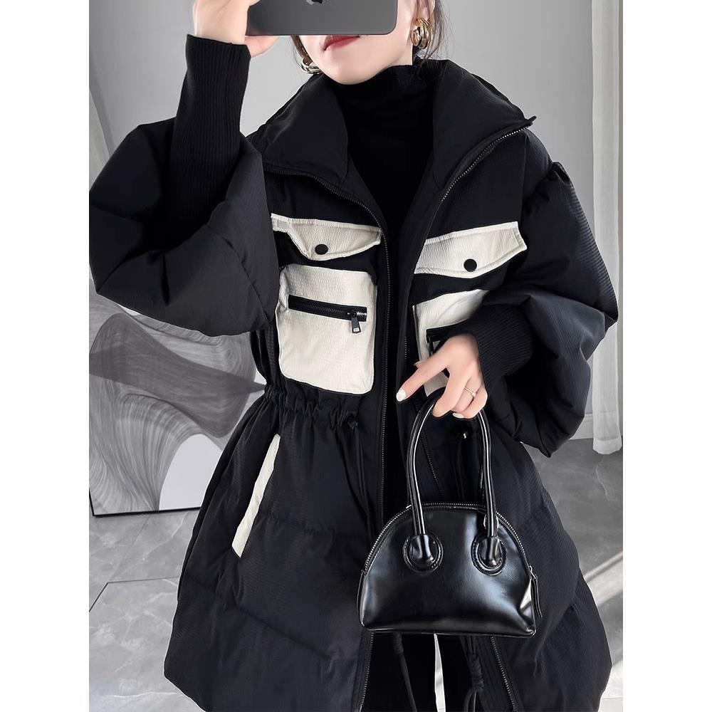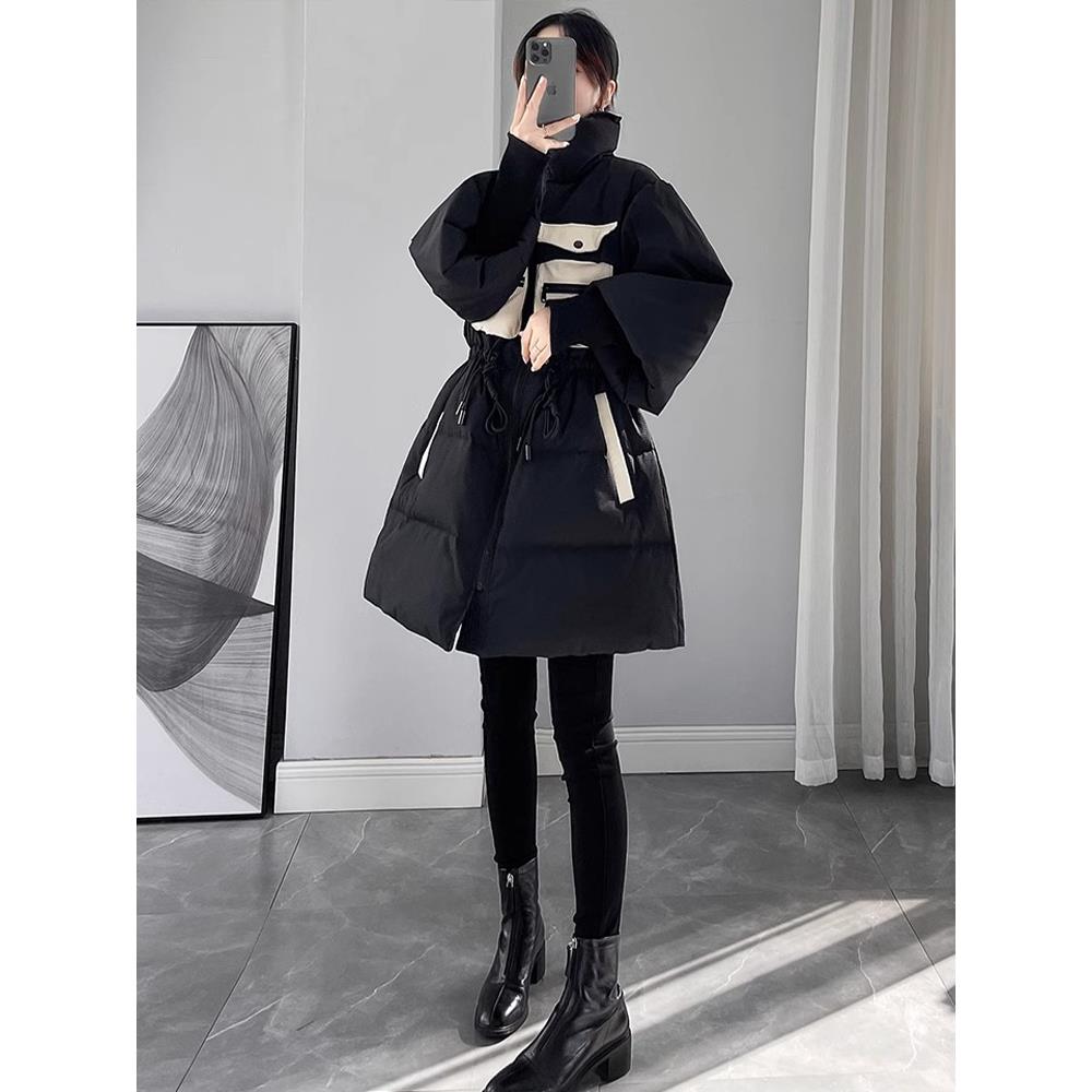 黑色中长款立领羽绒棉服女冬季大码宽松收腰款设计感撞色棉衣外套