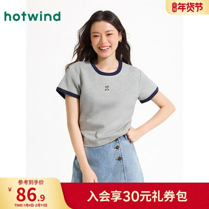 热风女士灰色短袖T恤上衣2025年夏季新款撞色动物印花正肩修身T恤